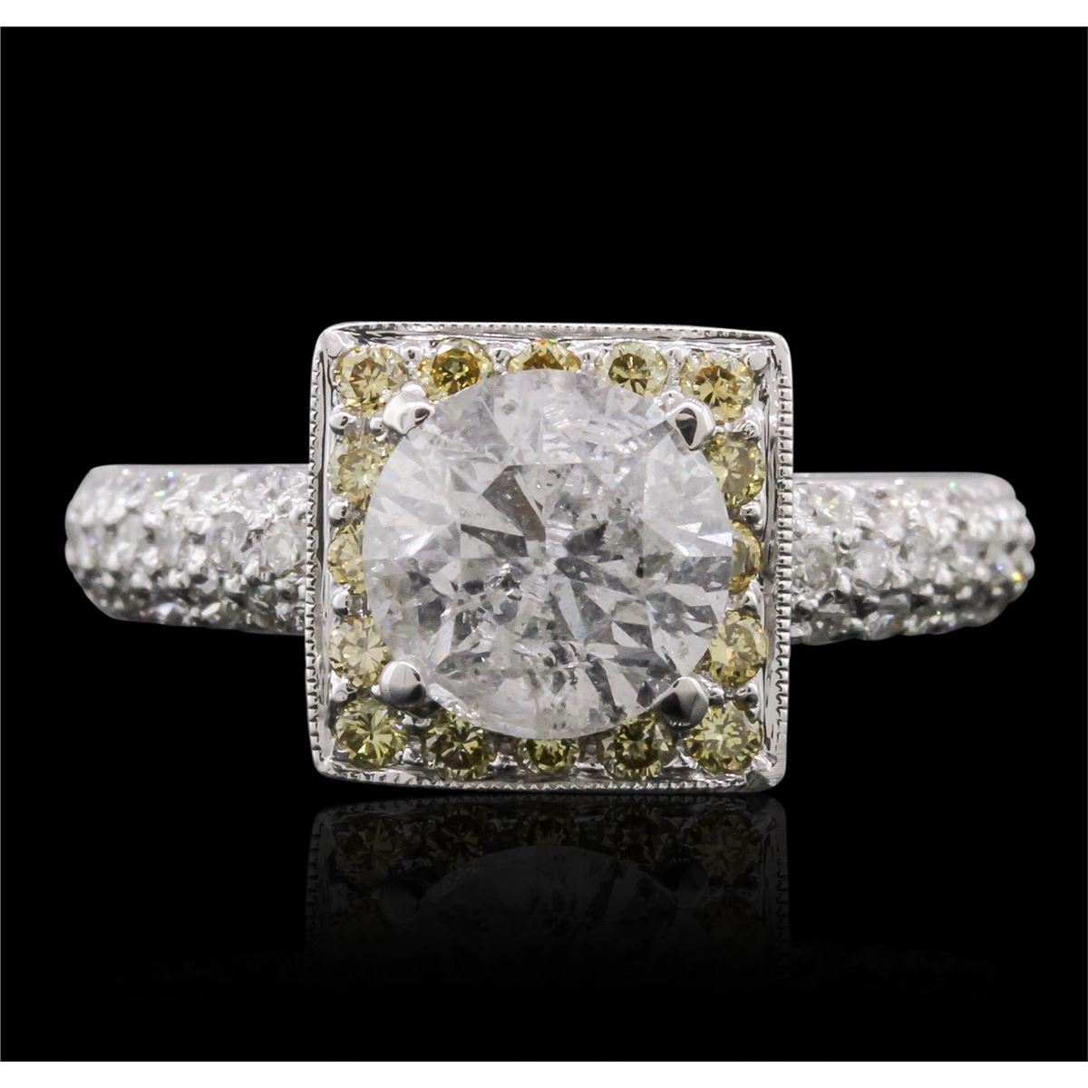 One electronically tested 18KT white gold Ladies combination cast & assembled engagement ring with a bright polish finish. Condition is new. Identified with markings of "18K". Containing: One prong set round brilliant cut diamond, measuring 7.40 - 7.40 x 4.80mm (depth est.) approximate weight of 1.60ct. Clarity: I-3. Color: I, Cut is Good. Forty-Four bead set round brilliant cut diamonds, measuring 1.50 - 1.40 x 0.87mm (depth est.) approximate. Total Weight of 44 Stones = 0.40ct. Clarity: SI-1 to I-1. Color: I - J, Cut is Good. Sixteen bead set round brilliant cut diamonds, measuring 1.50 - 1.50 x 0.90mm (depth est.) approximate. Total Weight of 16 Stones = 0.20ct. Clarity: VS-2, Cut is Good. Color of the stones has been enhanced. Total Weight of Diamonds 2.20ct. Total Weight of Ring 4.80 grams. GGL Appraised at $13,430.00.
