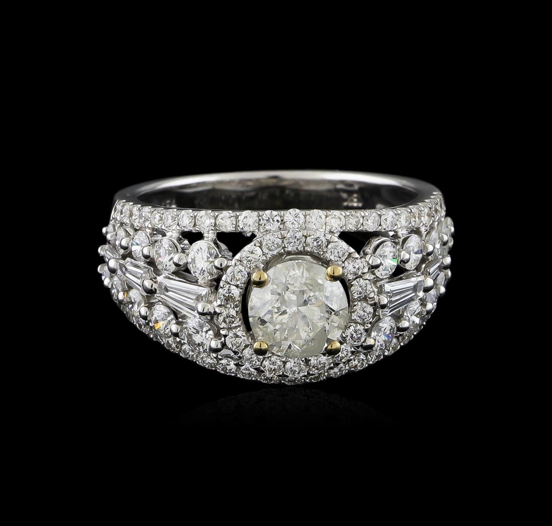 One electronically tested 18KT white gold ladies combination cast & assembled engagement ring with a bright polish finish. Identified with markings of "750". Condition is new. Containing: One prong set round brilliant cut diamond, measuring 5.94 - 5.93 x 3.92mm (depth est.) approximate weight of 0.84ct. Clarity: I-2. Color: I, Cut is Good. Eighty-Four prong set round brilliant cut diamonds, measuring 2.20 - 1.10 x 0.99mm (depth est.) approximate total weight of 84 Stones = 1.08ct. Clarity: SI-1 to I-1. Color: H - I, Cut is Good. Six prong set baguette cut diamonds, measuring from 2.00 x 1.30 x 1.11mm (depth est.) to 4.00 x 1.50 x 1.28mm (depth est.) approximate total weight of 6 Stones = 0.31ct. Clarity: VS-2. Color: I, Cut is Good. All diamonds are graded in the mounting, unless otherwise stated. Total Weight of Diamonds 2.23ct. Total Weight of Ring 5.90 grams. GGL Appraised at $12,910.00.