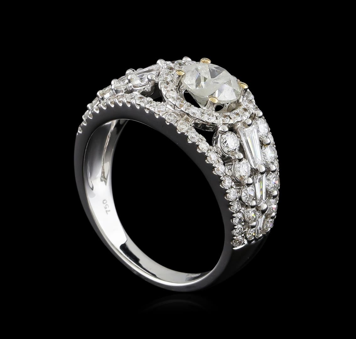 One electronically tested 18KT white gold ladies combination cast & assembled engagement ring with a bright polish finish. Identified with markings of "750". Condition is new. Containing: One prong set round brilliant cut diamond, measuring 5.94 - 5.93 x 3.92mm (depth est.) approximate weight of 0.84ct. Clarity: I-2. Color: I, Cut is Good. Eighty-Four prong set round brilliant cut diamonds, measuring 2.20 - 1.10 x 0.99mm (depth est.) approximate total weight of 84 Stones = 1.08ct. Clarity: SI-1 to I-1. Color: H - I, Cut is Good. Six prong set baguette cut diamonds, measuring from 2.00 x 1.30 x 1.11mm (depth est.) to 4.00 x 1.50 x 1.28mm (depth est.) approximate total weight of 6 Stones = 0.31ct. Clarity: VS-2. Color: I, Cut is Good. All diamonds are graded in the mounting, unless otherwise stated. Total Weight of Diamonds 2.23ct. Total Weight of Ring 5.90 grams. GGL Appraised at $12,910.00.