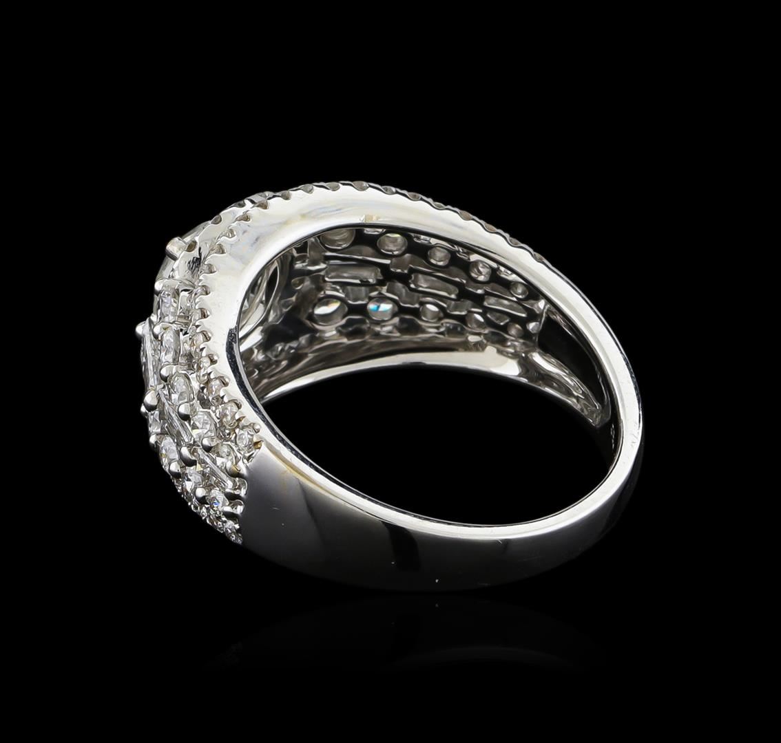 One electronically tested 18KT white gold ladies combination cast & assembled engagement ring with a bright polish finish. Identified with markings of "750". Condition is new. Containing: One prong set round brilliant cut diamond, measuring 5.94 - 5.93 x 3.92mm (depth est.) approximate weight of 0.84ct. Clarity: I-2. Color: I, Cut is Good. Eighty-Four prong set round brilliant cut diamonds, measuring 2.20 - 1.10 x 0.99mm (depth est.) approximate total weight of 84 Stones = 1.08ct. Clarity: SI-1 to I-1. Color: H - I, Cut is Good. Six prong set baguette cut diamonds, measuring from 2.00 x 1.30 x 1.11mm (depth est.) to 4.00 x 1.50 x 1.28mm (depth est.) approximate total weight of 6 Stones = 0.31ct. Clarity: VS-2. Color: I, Cut is Good. All diamonds are graded in the mounting, unless otherwise stated. Total Weight of Diamonds 2.23ct. Total Weight of Ring 5.90 grams. GGL Appraised at $12,910.00.