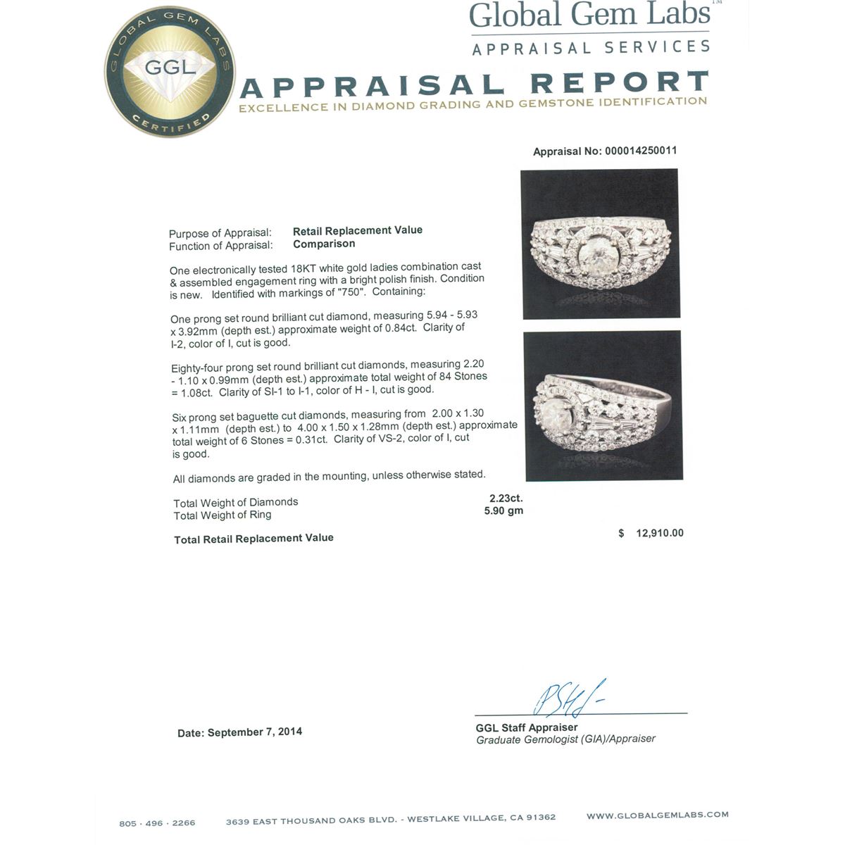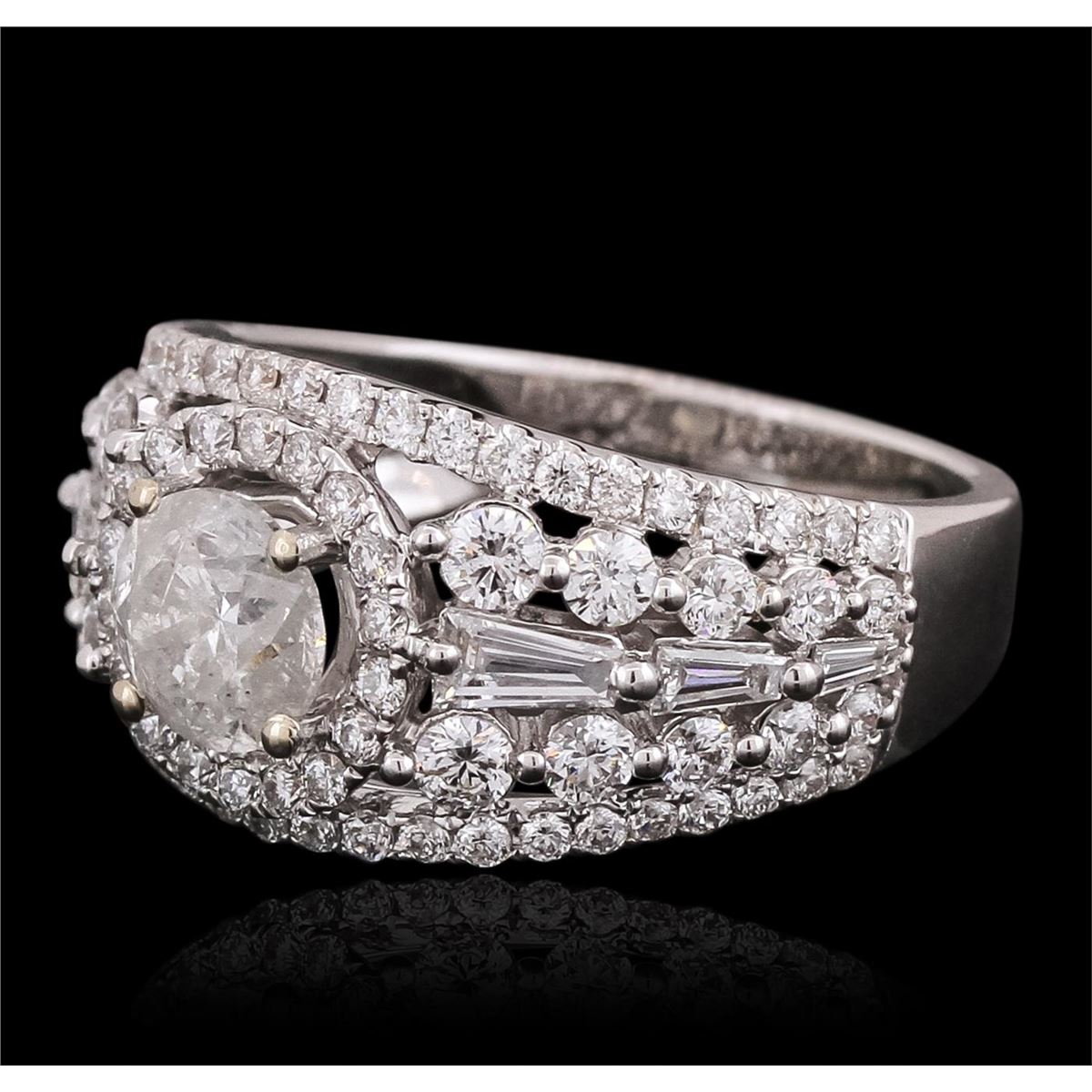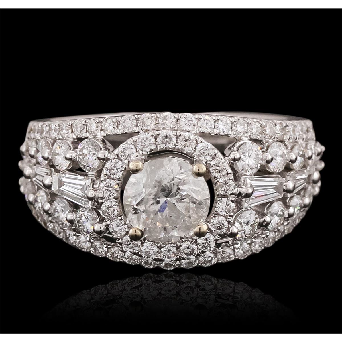 One electronically tested 18KT white gold ladies combination cast & assembled engagement ring with a bright polish finish. Identified with markings of "750". Condition is new. Containing: One prong set round brilliant cut diamond, measuring 5.94 - 5.93 x 3.92mm (depth est.) approximate weight of 0.84ct. Clarity: I-2. Color: I, Cut is Good. Eighty-Four prong set round brilliant cut diamonds, measuring 2.20 - 1.10 x 0.99mm (depth est.) approximate total weight of 84 Stones = 1.08ct. Clarity: SI-1 to I-1. Color: H - I, Cut is Good. Six prong set baguette cut diamonds, measuring from 2.00 x 1.30 x 1.11mm (depth est.) to 4.00 x 1.50 x 1.28mm (depth est.) approximate total weight of 6 Stones = 0.31ct. Clarity: VS-2. Color: I, Cut is Good. All diamonds are graded in the mounting, unless otherwise stated. Total Weight of Diamonds 2.23ct. Total Weight of Ring 5.90 grams. GGL Appraised at $12,910.00.