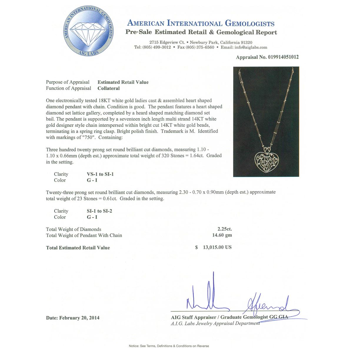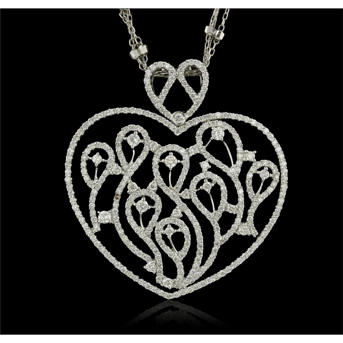 One electronically tested 18KT White Gold ladies cast & assembled heart shaped diamond pendant with chain. Condition is good. The pendant features a heart shaped diamond set lattice gallery, completed by a heard shaped matching diamond set bail. The pendant is supported by a seventeen inch length multi strand 14KT White Gold designer style chain interspersed within bright cut 14KT White Gold beads, terminating in a spring ring clasp. Bright polish finish. Trademark is M. Identified with markings of "750". Containing: Three Hundred Twenty prong set round brilliant cut diamonds, measuring 1.10 - 1.10 x 0.66mm (depth est.) approximate. Total Weight of 320 Stones = 1.64ct. Graded in the setting. Clarity: VS-1 to SI-1. Color: G - I Twenty-Three prong set round brilliant cut diamonds, measuring 2.30 - 0.70 x 0.90mm (depth est.) approximate. Total Weight of 23 Stones = 0.61ct. Graded in the setting. Clarity: SI-1 to SI-2. Color: G - I. Total Weight of Diamonds 2.25ct. Total Weight of Pendant 14.6 grams. AIG Appraised at $13,015.00.