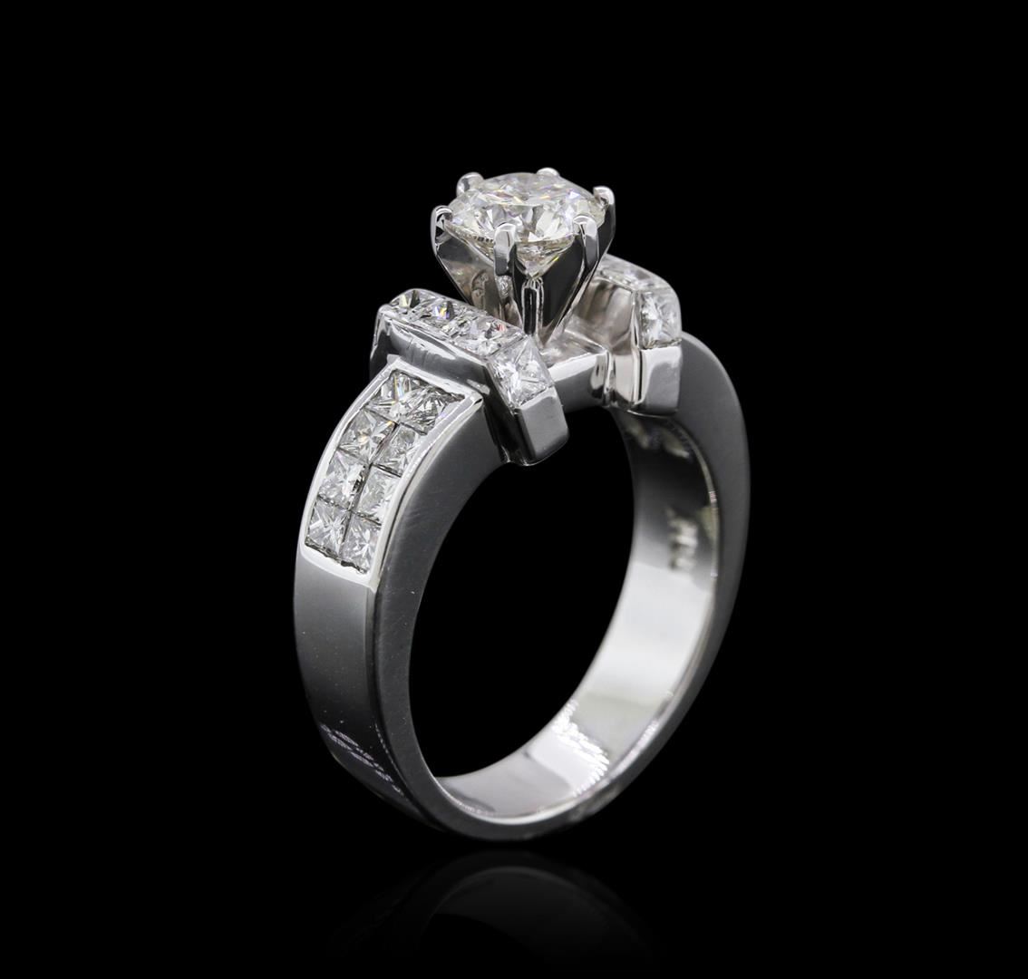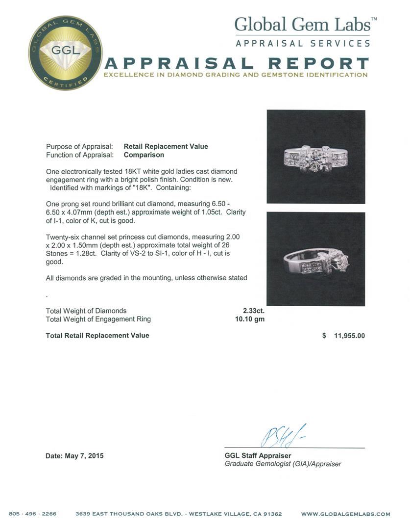 One electronically tested 18KT white gold ladies cast diamond engagement ring with a bright polish finish. Identified with markings of "18K". Condition is new. Containing: One prong set round brilliant cut diamond, measuring 6.50 - 6.50 x 4.07mm (depth est.) approximate weight of 1.05ct. Clarity: I-1. Color: K, Cut is Good. Twenty-Six channel set princess cut diamonds, measuring 2.00 x 2.00 x 1.50mm (depth est.) approximate total weight of 26 Stones = 1.28ct. Clarity: VS-2 to SI-1. Color: H - I, Cut is Good. All diamonds are graded in the mounting, unless otherwise stated. Total Weight of Diamonds 2.33ct. Total Weight of Engagement Ring 10.10 grams. GGL Appraised at $11,955.00.