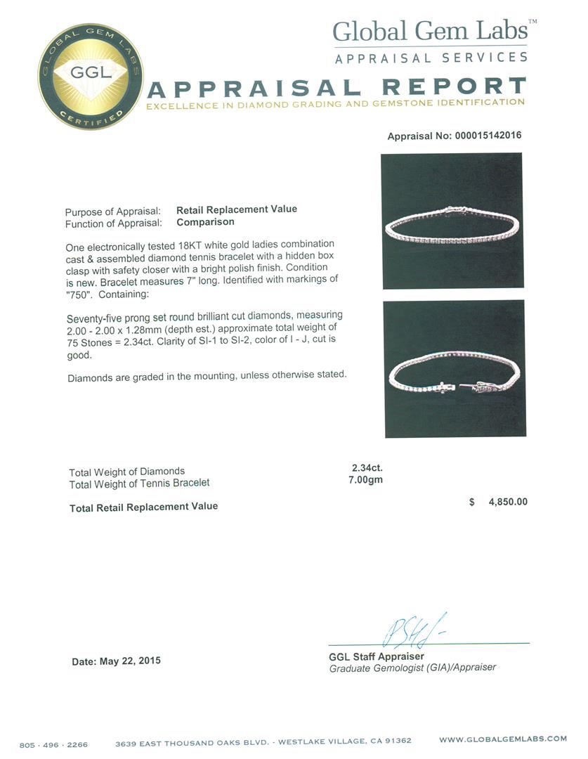 One electronically tested 18KT white gold ladies combination cast & assembled diamond tennis bracelet with a hidden box clasp with safety closer with a bright polish finish. Bracelet measures 7" long. Identified with markings of "750". Condition is new. Containing: Seventy-Five prong set round brilliant cut diamonds, measuring 2.00 - 2.00 x 1.28mm (depth est.) approximate total weight of 75 Stones = 2.34ct. Clarity: SI-1 to SI-2. Color: I - J, Cut is Good. Diamonds are graded in the mounting, unless otherwise stated. Total Weight of Diamonds 2.34ct. Total Weight of Tennis Bracelet 7.00 grams. GGL Appraised at $4,850.00.