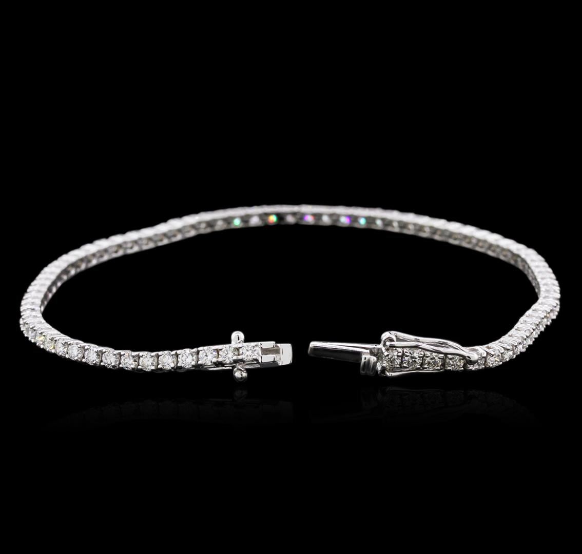One electronically tested 18KT white gold ladies combination cast & assembled diamond tennis bracelet with a hidden box clasp with safety closer with a bright polish finish. Bracelet measures 7" long. Identified with markings of "750". Condition is new. Containing: Seventy-Five prong set round brilliant cut diamonds, measuring 2.00 - 2.00 x 1.28mm (depth est.) approximate total weight of 75 Stones = 2.34ct. Clarity: SI-1 to SI-2. Color: I - J, Cut is Good. Diamonds are graded in the mounting, unless otherwise stated. Total Weight of Diamonds 2.34ct. Total Weight of Tennis Bracelet 7.00 grams. GGL Appraised at $4,850.00.