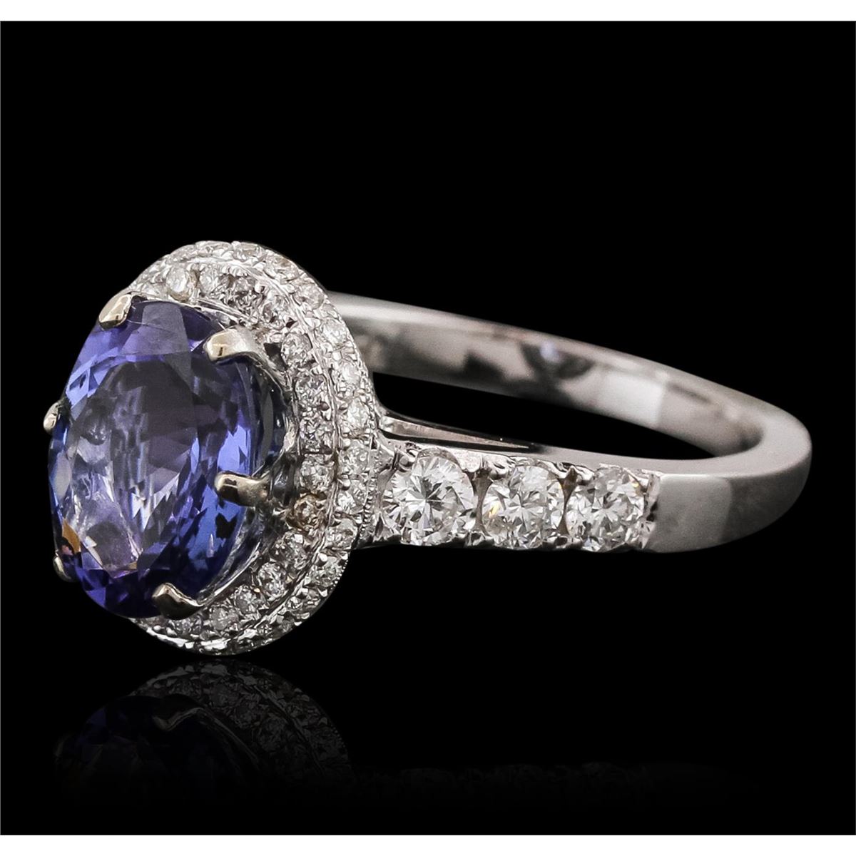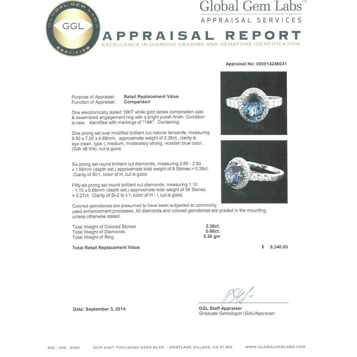 One electronically tested 18KT white gold ladies combination cast & assembled engagement ring with a bright polish finish. Identified with markings of "18K". Condition is new. Containing: One prong set oval modified brilliant cut natural tanzanite, measuring 9.50 x 7.50 x 4.88mm, approximate weight of 2.36ct., clarity is eye clean, type I, medium, moderately strong, violetish blue color, (GIA vB 5/4), cut is good. Six prong set round brilliant cut diamonds, measuring 2.60 - 2.60 x 1.56mm (depth est.) approximate total weight of 6 Stones = 0.39ct. Clarity: SI-1. Color: H, Cut is Good. Fifty-Six prong set round brilliant cut diamonds, measuring 1.10 - 1.10 x 0.66mm (depth est.) approximate total weight of 56 Stones = 0.27ct. Clarity: SI-2 to I-1. Color: H - I, Cut is Good. Colored gemstones are presumed to have been subjected to commonly used enhancement processes. All diamonds and colored gemstones are graded in the mounting, unless otherwise stated. Total Weight of Colored Stones 2.36ct. Total Weight of Diamonds 0.66ct. Total Weight of Ring 5.20 grams. GGL Appraised at $8,340.00.