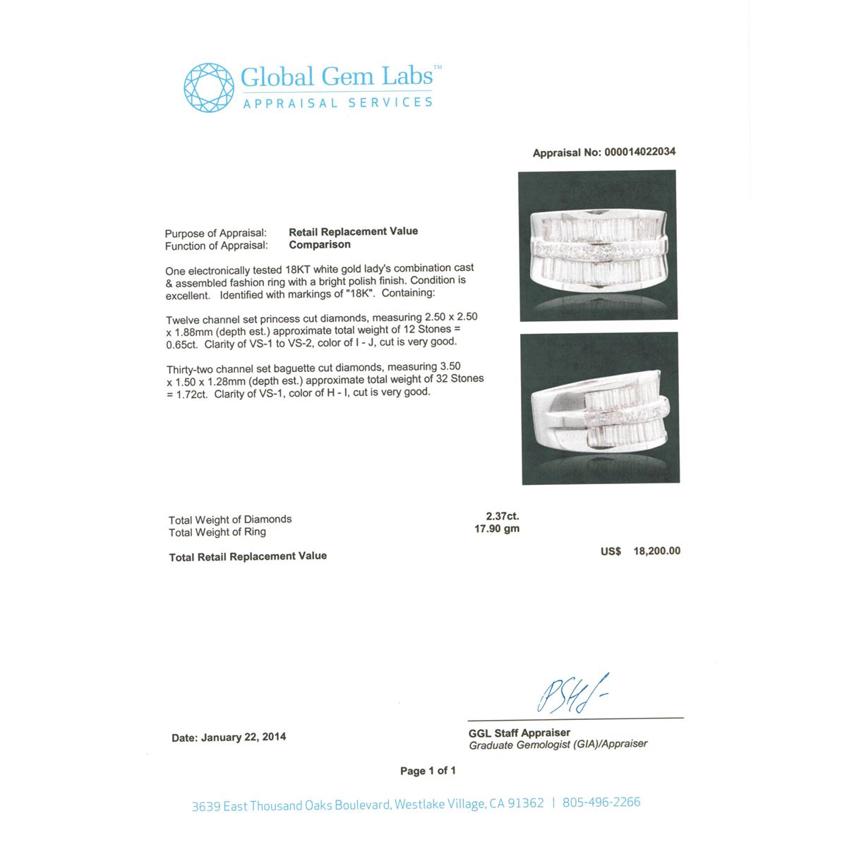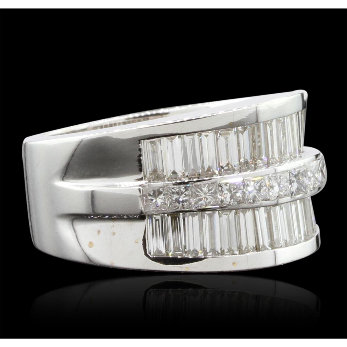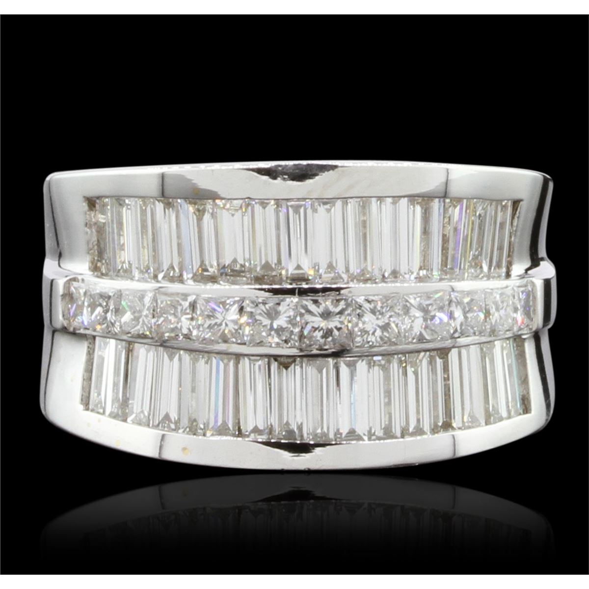 One electronically tested 18KT white gold Ladies combination cast & assembled fashion ring with a bright polish finish. Identified with markings of "18K". Condition is excellent. Containing: Twelve channel set princess cut diamonds, measuring 2.50 x 2.50 x 1.88mm (depth est.) approximate total weight of 12 Stones = 0.65ct. Clarity of VS-1 to VS-2, Color of I - J, Cut is Very Good. Thirty-Two channel set baguette cut diamonds, measuring 3.50 x 1.50 x 1.28mm (depth est.) approximate total weight of 32 Stones = 1.72ct. Clarity of VS-1, Color of H - I, Cut is Very Good. Total Weight of Diamonds 2.37ct. Total Weight of Ring 17.90gm. GGL Appraised at $18,200.00.
