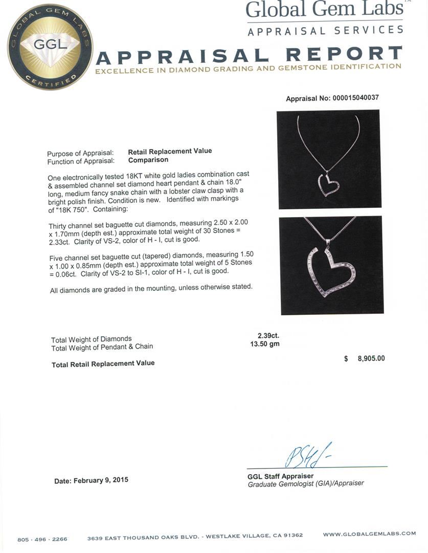 One electronically tested 18KT white gold ladies combination cast & assembled channel set diamond heart pendant & chain 18.0" long, medium fancy snake chain with a lobster claw clasp with a bright polish finish. Identified with markings of "18K 750". Condition is new. Containing: Thirty channel set baguette cut diamonds, measuring 2.50 x 2.00 x 1.70mm (depth est.) approximate total weight of 30 Stones = 2.33ct. Clarity: VS-2. Color: H - I, Cut is Good. Five channel set baguette cut (tapered) diamonds, measuring 1.50 x 1.00 x 0.85mm (depth est.) approximate total weight of 5 Stones = 0.06ct. Clarity: VS-2 to SI-1. Color: H - I, Cut is Good. All diamonds are graded in the mounting, unless otherwise stated. Total Weight of Diamonds 2.39ct. Total Weight of Pendant & Chain 13.50 grams. GGL Appraised at $8,905.00.