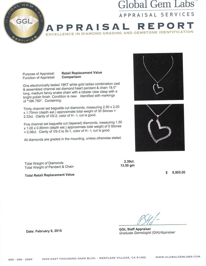 One electronically tested 18KT white gold ladies combination cast & assembled channel set diamond heart pendant & chain 18.0" long, medium fancy snake chain with a lobster claw clasp with a bright polish finish. Identified with markings of "18K 750". Condition is new. Containing: Thirty channel set baguette cut diamonds, measuring 2.50 x 2.00 x 1.70mm (depth est.) approximate total weight of 30 Stones = 2.33ct. Clarity: VS-2. Color: H - I, Cut is Good. Five channel set baguette cut (tapered) diamonds, measuring 1.50 x 1.00 x 0.85mm (depth est.) approximate total weight of 5 Stones = 0.06ct. Clarity: VS-2 to SI-1. Color: H - I, Cut is Good. All diamonds are graded in the mounting, unless otherwise stated. Total Weight of Diamonds 2.39ct. Total Weight of Pendant & Chain 13.50 grams. GGL Appraised at $8,905.00.