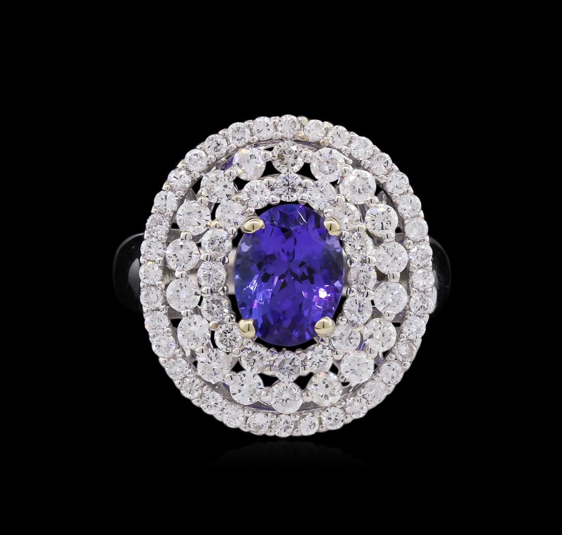 One electronically tested 18KT white gold Ladies combination cast & assembled ring with a bright polish finish. Condition is new. Identified with markings of "18K". Containing: One prong set oval modified brilliant cut natural tanzanite, measuring 8.70 x 7.80 x 5.30mm, approximate weight of 2.42ct., clarity is eye clean, type I, medium, moderately strong, violet color, (GIA V 5/4), cut is good. Colored gemstones are presumed to have been subjected to commonly used color/clarity enhancement processes. Seventy-One prong set round brilliant cut diamonds, measuring 1.90 - 1.30 x 0.96mm (depth est.) approximate. Total Weight of 71 Stones = 1.06ct. Clarity: I-1 to I-2. Color: H - I, Cut is Good. Total Weight of Colored Stones 2.42ct. Total Weight of Diamonds 1.06ct. Total Weight of Ring 6.80 grams. GGL Appraised at $8,515.00.
