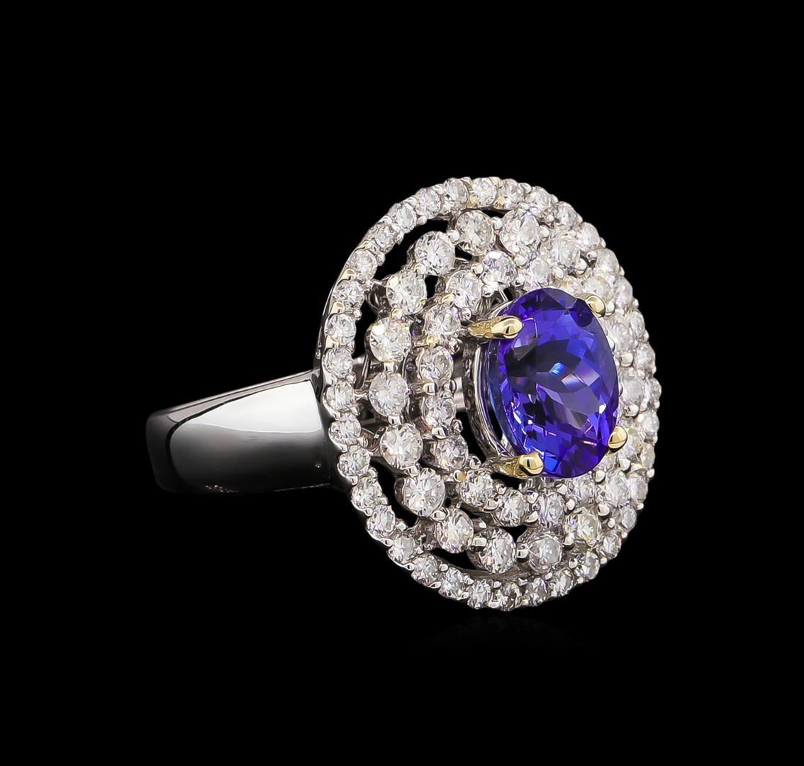 One electronically tested 18KT white gold Ladies combination cast & assembled ring with a bright polish finish. Condition is new. Identified with markings of "18K". Containing: One prong set oval modified brilliant cut natural tanzanite, measuring 8.70 x 7.80 x 5.30mm, approximate weight of 2.42ct., clarity is eye clean, type I, medium, moderately strong, violet color, (GIA V 5/4), cut is good. Colored gemstones are presumed to have been subjected to commonly used color/clarity enhancement processes. Seventy-One prong set round brilliant cut diamonds, measuring 1.90 - 1.30 x 0.96mm (depth est.) approximate. Total Weight of 71 Stones = 1.06ct. Clarity: I-1 to I-2. Color: H - I, Cut is Good. Total Weight of Colored Stones 2.42ct. Total Weight of Diamonds 1.06ct. Total Weight of Ring 6.80 grams. GGL Appraised at $8,515.00.