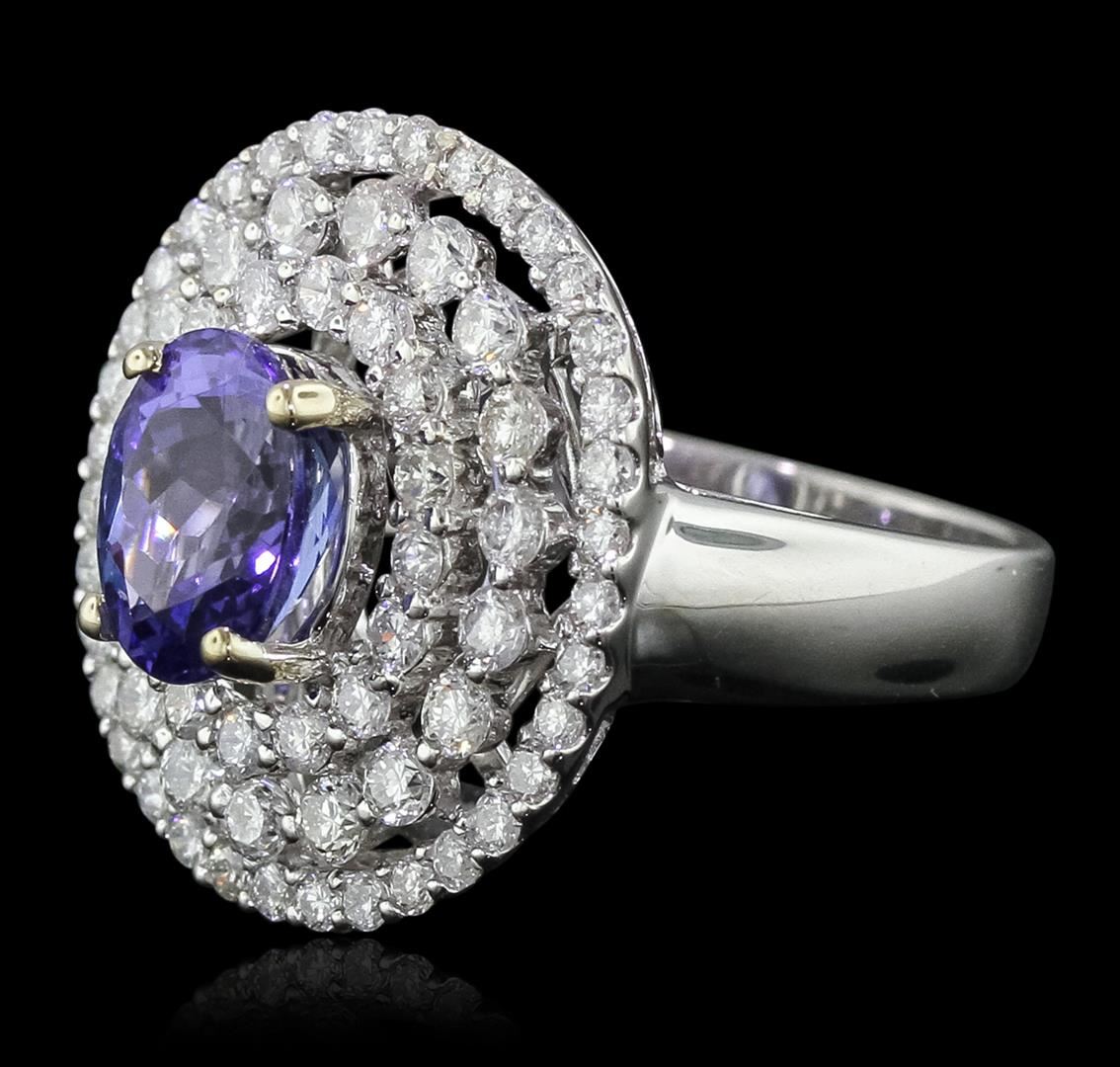 One electronically tested 18KT white gold Ladies combination cast & assembled ring with a bright polish finish. Condition is new. Identified with markings of "18K". Containing: One prong set oval modified brilliant cut natural tanzanite, measuring 8.70 x 7.80 x 5.30mm, approximate weight of 2.42ct., clarity is eye clean, type I, medium, moderately strong, violet color, (GIA V 5/4), cut is good. Colored gemstones are presumed to have been subjected to commonly used color/clarity enhancement processes. Seventy-One prong set round brilliant cut diamonds, measuring 1.90 - 1.30 x 0.96mm (depth est.) approximate. Total Weight of 71 Stones = 1.06ct. Clarity: I-1 to I-2. Color: H - I, Cut is Good. Total Weight of Colored Stones 2.42ct. Total Weight of Diamonds 1.06ct. Total Weight of Ring 6.80 grams. GGL Appraised at $8,515.00.
