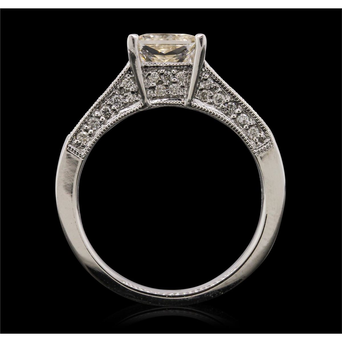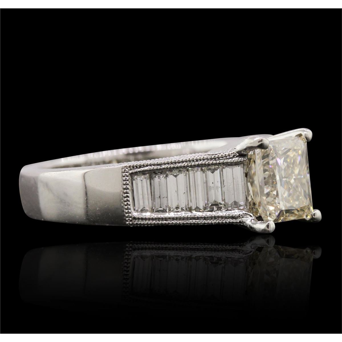 One electronically tested 18KT white gold ladies cast diamond unity ring. The featured diamond is supported by diamond set shoulders and completed by a two and one-half millimeter wide band. Bright polish finish with milgrain detailing throughout. Identified with markings of "18K 750". Condition is new, good workmanship. Containing: One prong set princess cut diamond, measuring 6.40 x 5.80 x 4.40mm (depth est.) approximate weight of 1.38ct with a strong blue fluorescence. Faint brown secondary color throughout. Graded in the setting. Clarity: SI-1. Color: L Depth 75.9%. Table 70.7%. Twelve channel set baguette cut diamonds, measuring from 3.30 x 1.20 x 1.02mm (depth est.) to 3.80 x 1.50 x 1.28mm (depth est.) approximate. Total Weight of 12 Stones = 0.74ct. Graded in the setting. Clarity: VVS-2 to VS-2. Color: G - I Thirty-Four bead set round brilliant cut diamonds, measuring 1.30 - 1.00 x 0.69mm (depth est.) approximate. Total Weight of 34 Stones = 0.31ct. Graded in the setting. Clarity: VS-2 to SI-2. Color: G - I. Total Weight of Diamonds 2.43ct. Total Weight of Ring 7.50 grams. AIG Appraised at $20,500.00.