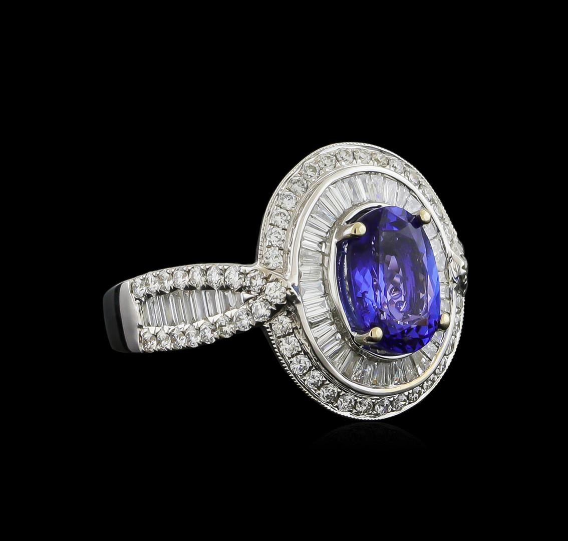 One electronically tested 18KT white gold ladies combination cast & assembled engagement ring with a bright polish finish. Identified with markings of "18K". Condition is new. Containing: One prong set oval modified brilliant cut natural tanzanite, measuring 10.00 x 7.42 x 4.82mm, approximate weight of 2.45ct., clarity is eye clean, type I, medium, moderately strong, bluish violet color, (GIA bV 5/4), cut is good. Sixty-Four prong set round brilliant cut diamonds, measuring 1.50 - 1.50 x 0.90mm (depth est.) approximate total weight of 64 Stones = 0.79ct. Clarity: SI-1 to SI-2. Color: I - J, Cut is Good. Fifty-Nine channel set baguette cut diamonds, measuring from 1.20 x 1.20 x 1.02mm (depth est.) to 1.80 x 1.50 x 1.28mm (depth est.) approximate total weight of 59 Stones = 1.26ct. Clarity: SI-1. Color: H - I, Cut is Good. Colored gemstones are presumed to have been subjected to commonly used enhancement processes. All diamonds and colored gemstones are graded in the mounting, unless otherwise stated. Total Weight of Colored Stones 2.45ct. Total Weight of Diamonds 2.04ct. Total Weight of Ring 9.80 grams. GGL Appraised at $12,730.00.