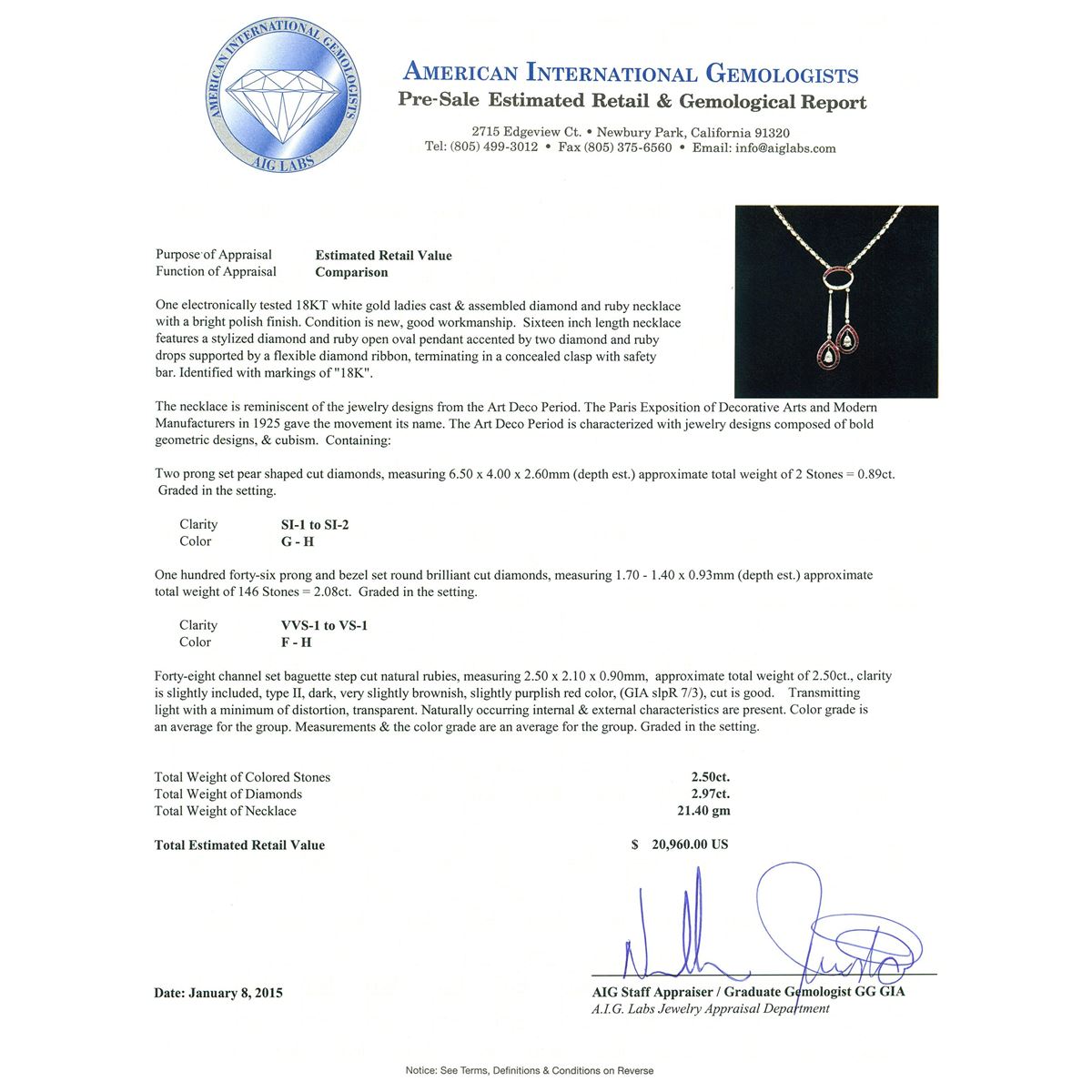 One electronically tested 18KT white gold ladies cast & assembled diamond and ruby necklace with a bright polish finish. Sixteen inch length necklace features a stylized diamond and ruby open oval pendant accented by two diamond and ruby drops supported by a flexible diamond ribbon, terminating in a concealed clasp with safety bar. Identified with markings of "18K".The necklace is reminiscent of the jewelry designs from the Art Deco Period. The Paris Exposition of Decorative Arts and Modern Manufacturers in 1925 gave the movement its name. The Art Deco Period is characterized with jewelry designs composed of bold geometric designs, & cubism. Condition is new, good workmanship. Containing: Two prong set pear shaped cut diamonds, measuring 6.50 x 4.00 x 2.60mm (depth est.) approximate total weight of 2 Stones = 0.89ct. Graded in the setting. Clarity: SI-1 to SI-2. Color: G - H One Hundred Forty-Six prong and bezel set round brilliant cut diamonds, measuring 1.70 - 1.40 x 0.93mm (depth est.) approximate total weight of 146 Stones = 2.08ct. Graded in the setting. Clarity: VVS-1 to VS-1. Color: F - H Forty-eight channel set baguette step cut natural rubies, measuring 2.50 x 2.10 x 0.90mm, approximate total weight of 2.50ct., clarity is slightly included, type II, dark, very slightly brownish, slightly purplish red color, (GIA slpR 7/3), cut is good. Transmitting light with a minimum of distortion, transparent. Naturally occurring internal & external characteristics are present. Color grade is an average for the group. Measurements & the color grade are an average for the group. Graded in the setting. Total Weight of Colored Stones 2.50ct. Total Weight of Diamonds 2.97ct. Total Weight of Necklace 21.40 grams. AIG Appraised at $20,960.00.