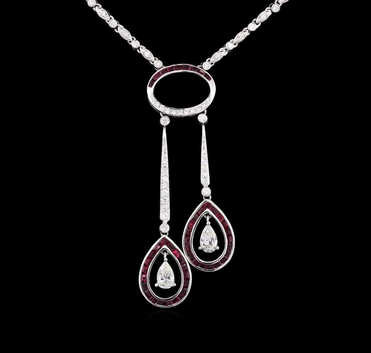 One electronically tested 18KT white gold ladies cast & assembled diamond and ruby necklace with a bright polish finish. Sixteen inch length necklace features a stylized diamond and ruby open oval pendant accented by two diamond and ruby drops supported by a flexible diamond ribbon, terminating in a concealed clasp with safety bar. Identified with markings of "18K".The necklace is reminiscent of the jewelry designs from the Art Deco Period. The Paris Exposition of Decorative Arts and Modern Manufacturers in 1925 gave the movement its name. The Art Deco Period is characterized with jewelry designs composed of bold geometric designs, & cubism. Condition is new, good workmanship. Containing: Two prong set pear shaped cut diamonds, measuring 6.50 x 4.00 x 2.60mm (depth est.) approximate total weight of 2 Stones = 0.89ct. Graded in the setting. Clarity: SI-1 to SI-2. Color: G - H One Hundred Forty-Six prong and bezel set round brilliant cut diamonds, measuring 1.70 - 1.40 x 0.93mm (depth est.) approximate total weight of 146 Stones = 2.08ct. Graded in the setting. Clarity: VVS-1 to VS-1. Color: F - H Forty-eight channel set baguette step cut natural rubies, measuring 2.50 x 2.10 x 0.90mm, approximate total weight of 2.50ct., clarity is slightly included, type II, dark, very slightly brownish, slightly purplish red color, (GIA slpR 7/3), cut is good. Transmitting light with a minimum of distortion, transparent. Naturally occurring internal & external characteristics are present. Color grade is an average for the group. Measurements & the color grade are an average for the group. Graded in the setting. Total Weight of Colored Stones 2.50ct. Total Weight of Diamonds 2.97ct. Total Weight of Necklace 21.40 grams. AIG Appraised.