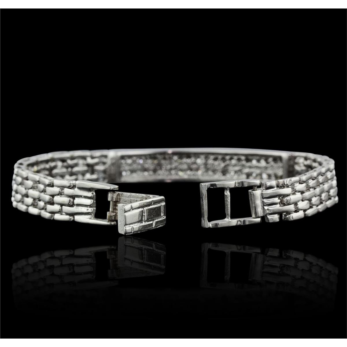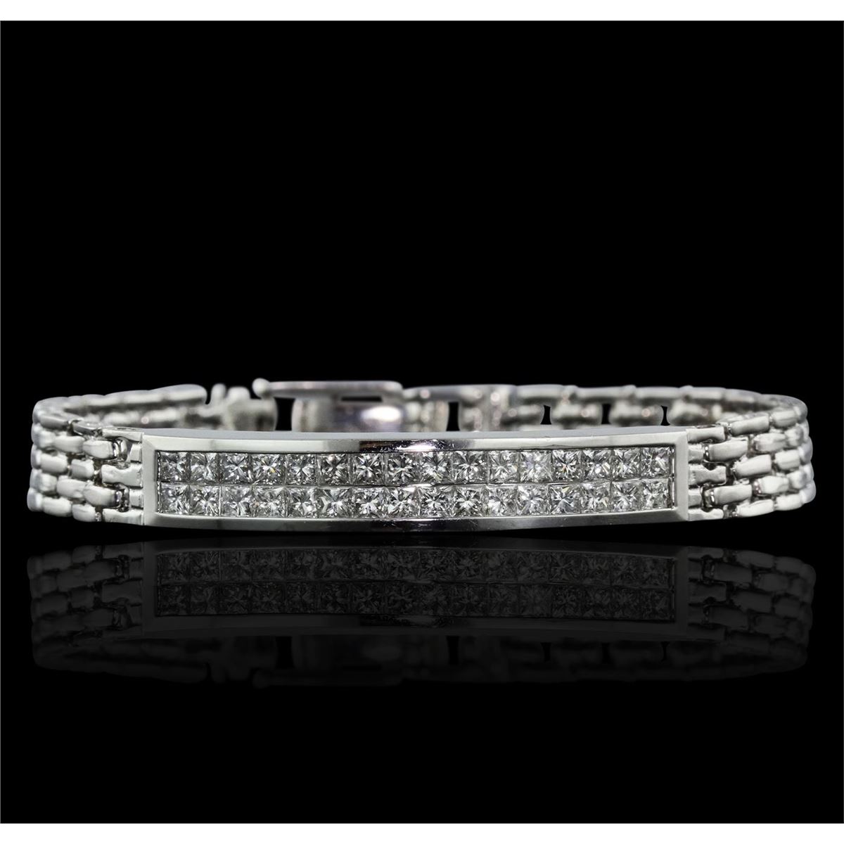 One electronically tested 18KT white gold ladies cast & assembled diamond bracelet with a bright polish finish. Condition is new, good workmanship. Six inch length bracelet features a rigid diamond set section supported by a designer watch style bracelet terminating in a fold over locking clasp. Identified with markings of "18K". Containing: Thirty-Two invisible set princess cut diamonds, measuring 2.30 x 2.30 x 1.73mm (depth est.) approximate. Total Weight of 32 Stones = 2.50ct. Measurements are an average for the group. Graded in the setting. Clarity: VS-1 to SI-1. Color: G - I. Total Weight of Diamonds 2.50ct. Total Weight of Bracelet 21.30 grams. AIG Appraised at $12,500.00.