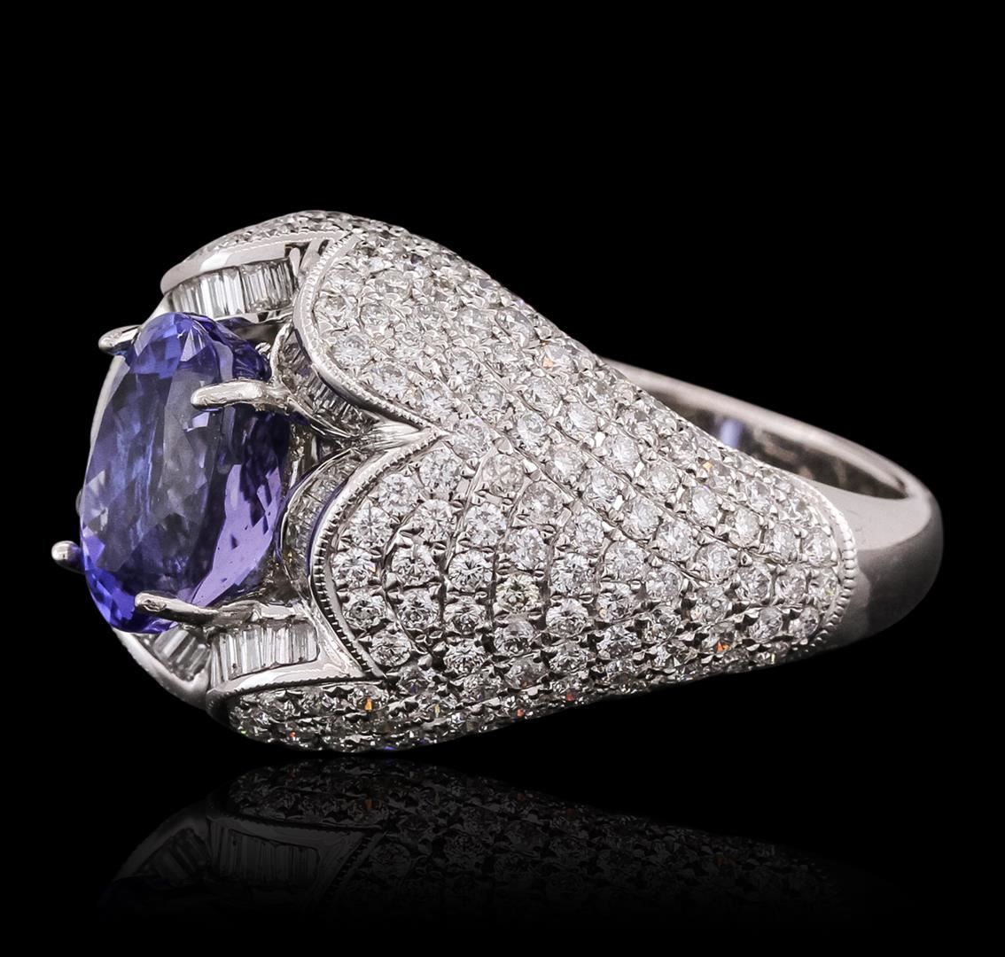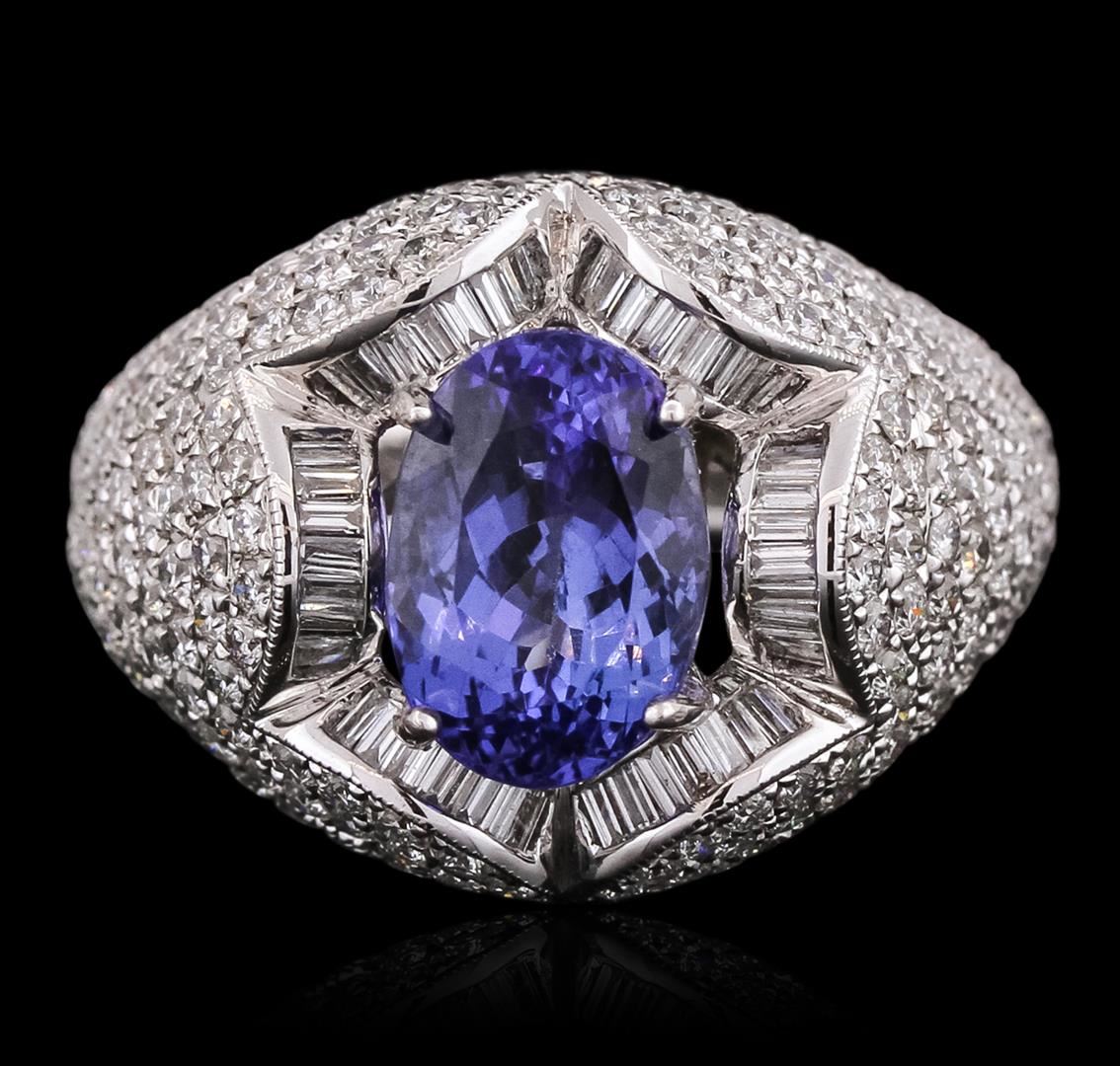One electronically tested 18KT white gold ladies combination cast & assembled prong set ring with a bright polish finish. Identified with markings of "750". Condition is new. Containing: One prong set oval modified brilliant cut natural tanzanite, measuring 10.51 x 7.35 x 4.70mm, approximate weight of 2.51ct., clarity is eye clean, type I, medium, moderately strong, bluish violet color, (GIA bV 5/4), cut is good. Two Hundred Sixty-Three prong set round brilliant cut diamonds, measuring 1.50 - 1.50 x 0.90mm (depth est.) approximate total weight of 263 Stones = 2.67ct. Clarity: SI-1 to I-1. Color: I - J, Cut is Good. Forty-Two channel set baguette cut diamonds, measuring 1.50 x 1.00 x 0.85mm (depth est.) approximate total weight of 42 Stones = 0.38ct. Clarity: SI-2. Color: H, Cut is Good. Colored gemstones are presumed to have been subjected to commonly used enhancement processes. All diamonds and colored gemstones are graded in the mounting, unless otherwise stated. Total Weight of Colored Stones 2.51ct. Total Weight of Diamonds 3.05ct. Total Weight of Ring 11.50 grams. GGL Appraised at $14,860.00.