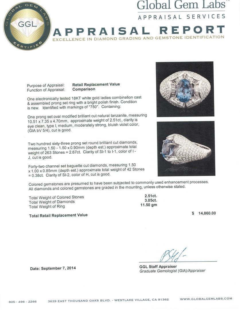 One electronically tested 18KT white gold ladies combination cast & assembled prong set ring with a bright polish finish. Identified with markings of "750". Condition is new. Containing: One prong set oval modified brilliant cut natural tanzanite, measuring 10.51 x 7.35 x 4.70mm, approximate weight of 2.51ct., clarity is eye clean, type I, medium, moderately strong, bluish violet color, (GIA bV 5/4), cut is good. Two Hundred Sixty-Three prong set round brilliant cut diamonds, measuring 1.50 - 1.50 x 0.90mm (depth est.) approximate total weight of 263 Stones = 2.67ct. Clarity: SI-1 to I-1. Color: I - J, Cut is Good. Forty-Two channel set baguette cut diamonds, measuring 1.50 x 1.00 x 0.85mm (depth est.) approximate total weight of 42 Stones = 0.38ct. Clarity: SI-2. Color: H, Cut is Good. Colored gemstones are presumed to have been subjected to commonly used enhancement processes. All diamonds and colored gemstones are graded in the mounting, unless otherwise stated. Total Weight of Colored Stones 2.51ct. Total Weight of Diamonds 3.05ct. Total Weight of Ring 11.50 grams. GGL Appraised.