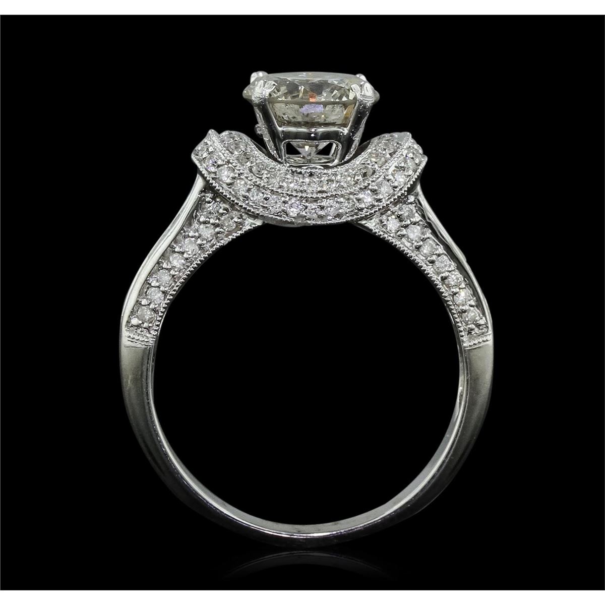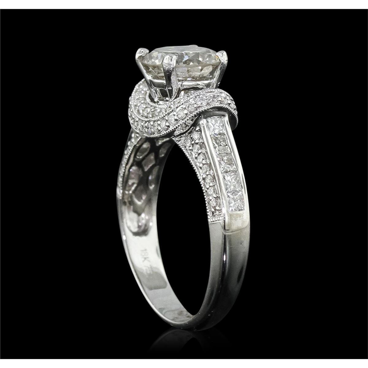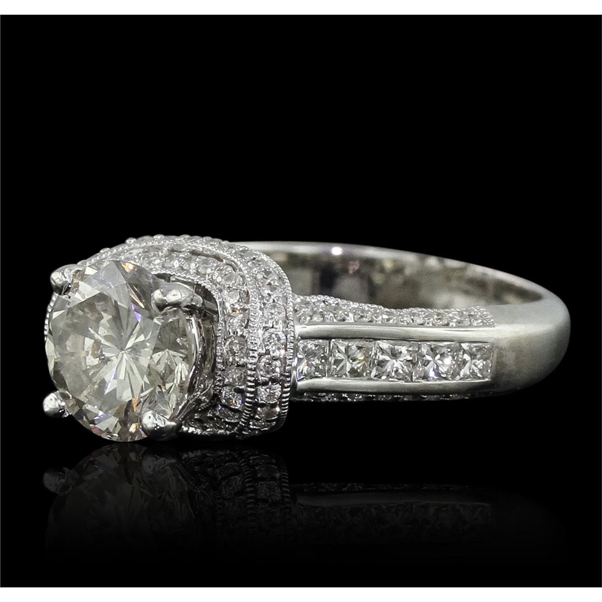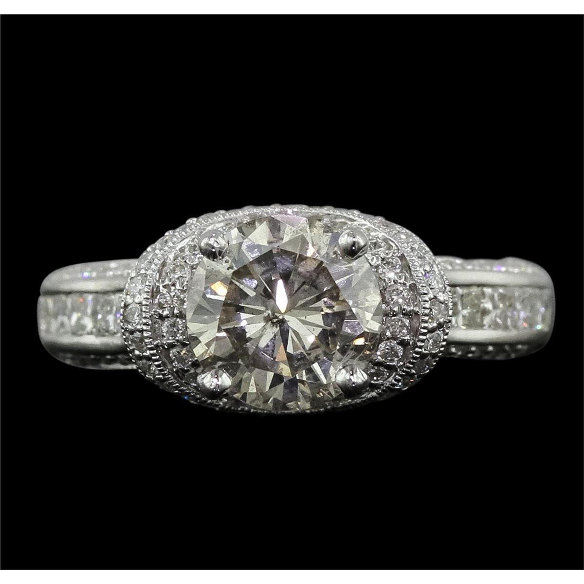 One electronically tested 18KT white gold Ladies combination cast & assembled engagement ring with a bright polish finish. Condition is new. Identified with markings of "18K". Containing: One prong set round brilliant cut diamond, measuring 7.63 - 7.60 x 4.57mm (depth est.) approximate weight of 1.62ct. Clarity: I-1, Cut is Good. Ten channel set princess cut diamonds, measuring 2.00 x 2.00 x 1.50mm (depth est.) approximate. Total Weight of 10 Stones = 0.49ct. Clarity: SI-1. Color: J, Cut is Good. Ninety bead set round brilliant cut diamonds, measuring 1.10 - 1.10 x 0.66mm (depth est.) approximate. Total Weight of 90 Stones = 0.43ct. Clarity: I-1 to I-2. Color: I, Cut is Good. Total Weight of Diamonds 2.54ct. Total Weight of Engagement Ring 4.90 grams. GGL Appraised at $14,280.00.