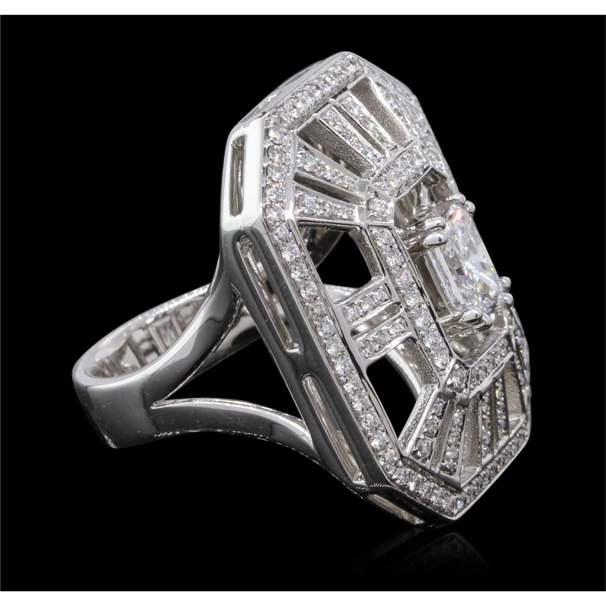 One electronically tested 18KT white gold Ladies combination cast & assembled fancy ring with a bright polish finish. Identified with markings of "18K". Condition is new. Containing: One prong set radiant shaped cut diamond, measuring 6.80 x 4.85 x 3.64mm (depth est.) approximate weight of 1.02ct. Clarity of I-1, Color of I, Cut is Good. One Hundred Forty bead set round brilliant cut diamonds, measuring 1.50 - 1.40 x 0.87mm (depth est.) approximate total weight of 140 Stones = 1.55ct. Clarity of SI-1 to SI-2, Color of H - I, Cut is Good. Total Weight of Diamonds 2.57ct. Total Weight of Ring 17.70gm. GGL Appraised at $24,415.00.
