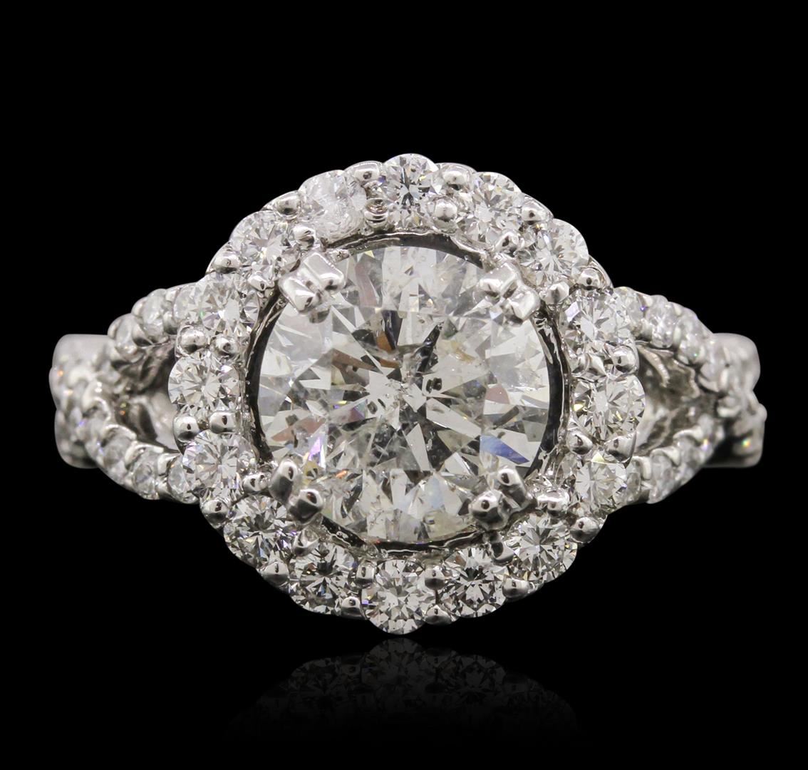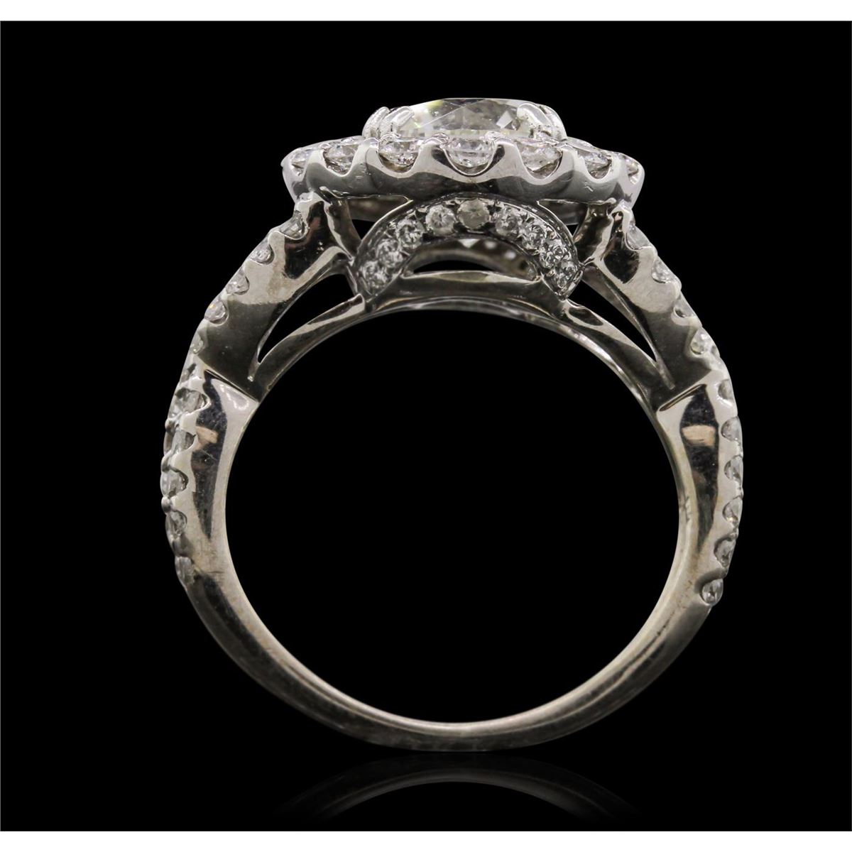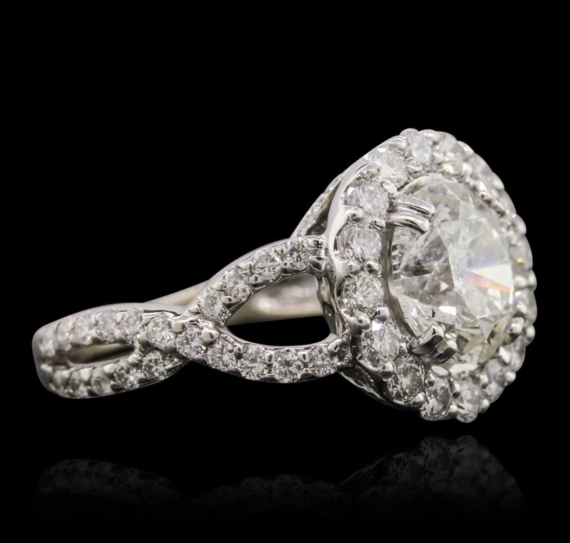 One electronically tested 18KT white gold Ladies combination cast & assembled engagement ring with a bright polish finish. Condition is new. Identified with markings of "750". Containing: One prong set round brilliant cut diamond, measuring 8.10 - 8.10 x 4.70mm (depth est.) approximate weight of 1.88ct. Clarity: I-2. Color: J, Cut is Good. Fifty-Six prong set round brilliant cut diamonds, measuring 1.90 - 1.50 x 1.02mm (depth est.) approximate. Total Weight of 56 Stones = 0.70ct. Clarity: SI-2 to I-1. Color: K, Cut is Good. Total Weight of Diamonds 2.58ct. Total Weight of Engagement Ring 6.00 grams. GGL Appraised at $22,260.00.