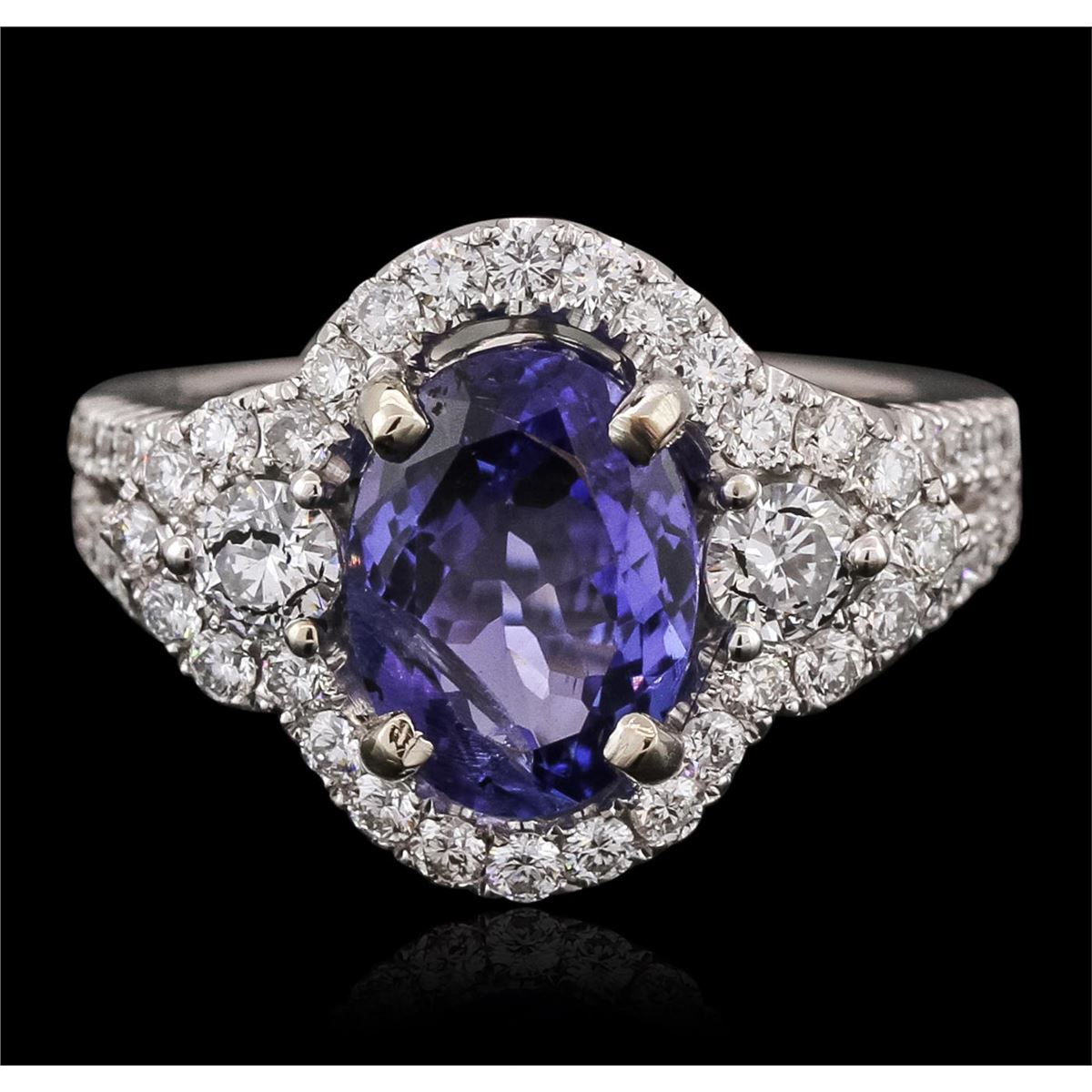 One electronically tested 18KT white gold ladies combination cast & assembled prong set ring with a split shoulder shank with a bright polish finish. Identified with markings of "750 18K". Condition is new. Containing: One prong set oval modified brilliant cut natural tanzanite, measuring 10.40 x 7.70 x 4.73mm, approximate weight of 2.60ct., clarity is eye clean, type I, medium light, very slightly grayish, violet color, (GIA V 4/3), cut is good. Two prong set round brilliant cut diamonds, measuring 3.50 - 3.50 x 2.10mm (depth est.) approximate total weight of 2 Stones = 0.31ct. Clarity: SI-1. Color: I, Cut is Very Good. Forty-Eight prong set round brilliant cut diamonds, measuring 1.50 - 1.50 x 0.90mm (depth est.) approximate total weight of 48 Stones = 0.86ct. Clarity: SI-2. Color: I, Cut is Good. All diamonds are graded in the mounting, unless otherwise stated, Colored gemstones are presumed to have been subjected to commonly used enhancement processes. Total Weight of Colored Stones 2.60ct. Total Weight of Diamonds 1.17ct. Total Weight of Ring 7.20 grams. GGL Appraised at $9,915.00.