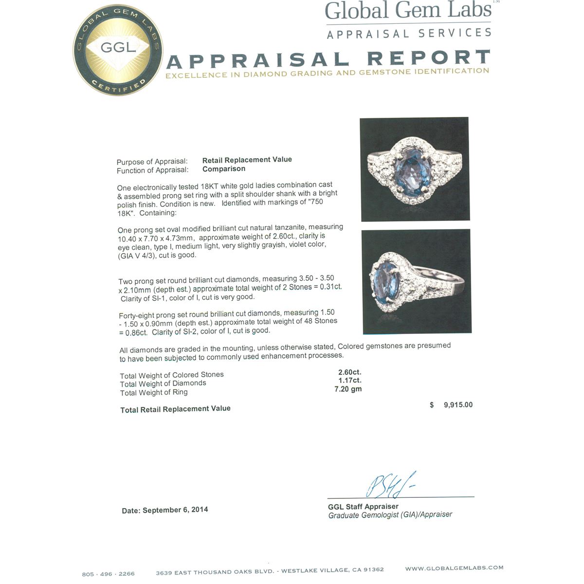 One electronically tested 18KT white gold ladies combination cast & assembled prong set ring with a split shoulder shank with a bright polish finish. Identified with markings of "750 18K". Condition is new. Containing: One prong set oval modified brilliant cut natural tanzanite, measuring 10.40 x 7.70 x 4.73mm, approximate weight of 2.60ct., clarity is eye clean, type I, medium light, very slightly grayish, violet color, (GIA V 4/3), cut is good. Two prong set round brilliant cut diamonds, measuring 3.50 - 3.50 x 2.10mm (depth est.) approximate total weight of 2 Stones = 0.31ct. Clarity: SI-1. Color: I, Cut is Very Good. Forty-Eight prong set round brilliant cut diamonds, measuring 1.50 - 1.50 x 0.90mm (depth est.) approximate total weight of 48 Stones = 0.86ct. Clarity: SI-2. Color: I, Cut is Good. All diamonds are graded in the mounting, unless otherwise stated, Colored gemstones are presumed to have been subjected to commonly used enhancement processes. Total Weight of Colored Stones 2.60ct. Total Weight of Diamonds 1.17ct. Total Weight of Ring 7.20 grams. GGL Appraised at $9,915.00.