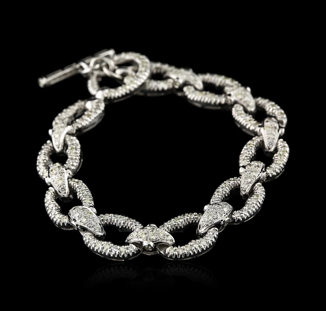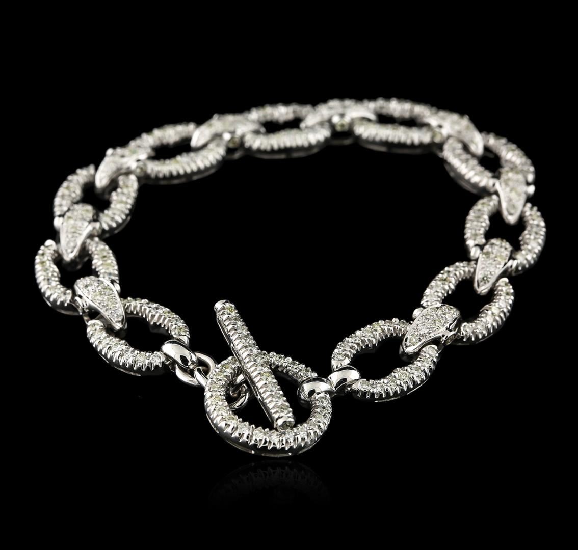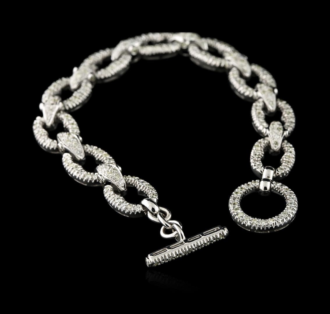 One electronically tested 18KT white gold ladies cast diamond bracelet with a toggle clasp with a bright polish finish. Measurements: 7.50" in length. Condition is new. Containing: Two Hundred Sixty-Four prong set round brilliant cut diamonds, measuring 1.50 - 1.30 x 0.84mm (depth est.) approximate total weight of 264 Stones = 2.64ct. Clarity: VS-2 to SI-1. Color: I - K, Cut is Good. Diamonds are graded in the mounting, unless otherwise stated. Total Weight of Diamonds 2.64ct. Total Weight of Bracelet 37.50 grams. GGL Appraised at $11,005.00.