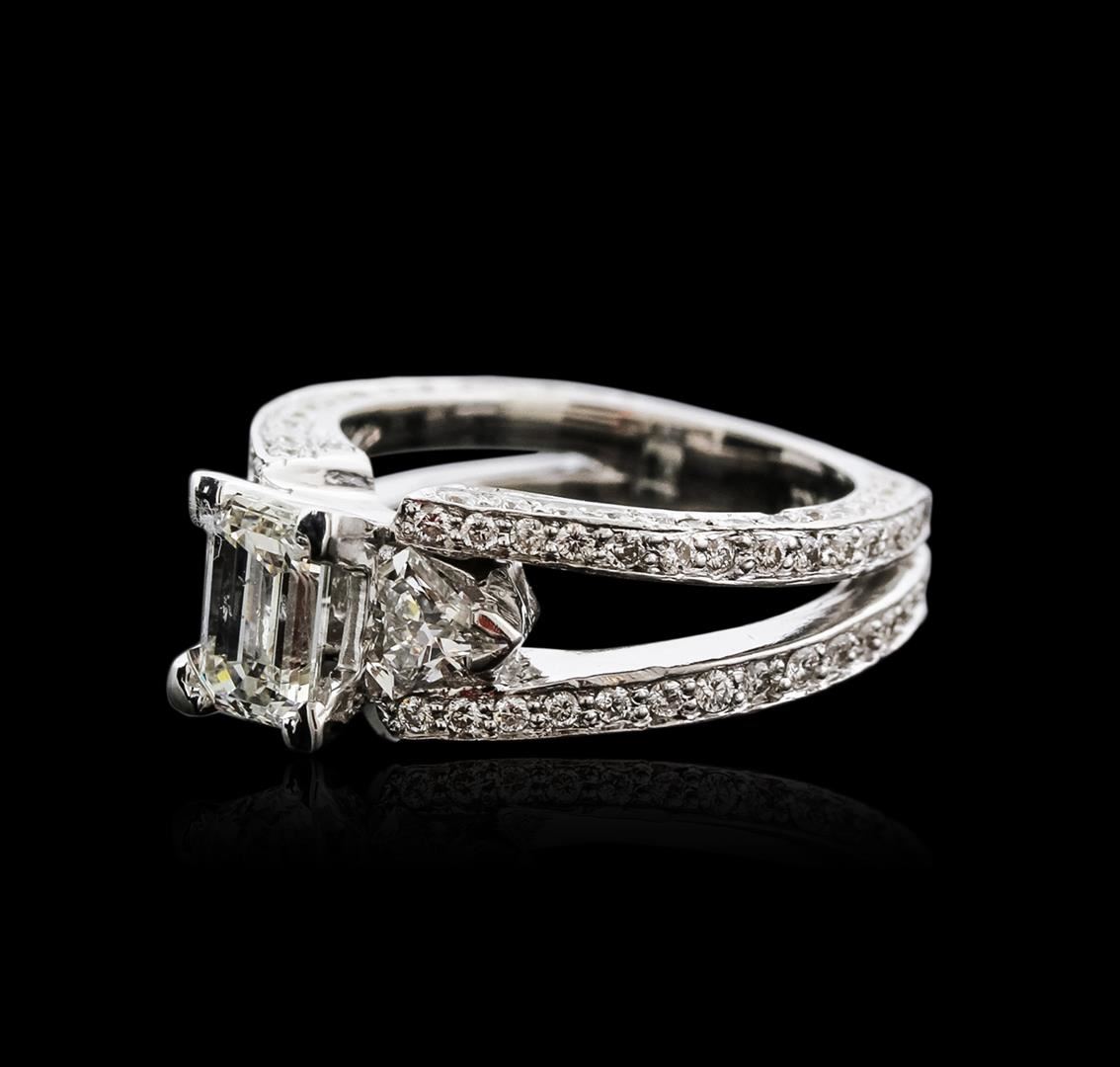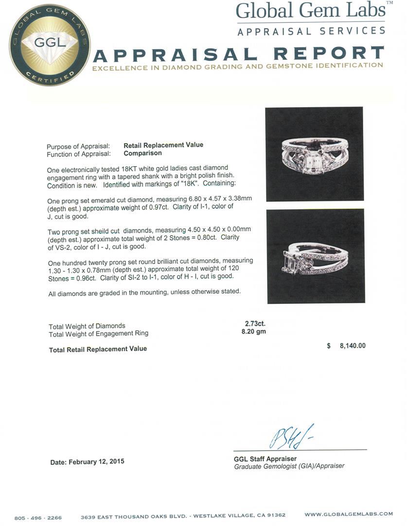 One electronically tested 18KT white gold ladies cast diamond engagement ring with a tapered shank with a bright polish finish. Identified with markings of "18K". Condition is new. Containing: One prong set emerald cut diamond, measuring 6.80 x 4.57 x 3.38mm (depth est.) approximate weight of 0.97ct. Clarity: I-1. Color: J, Cut is Good. Two prong set sheild cut diamonds, measuring 4.50 x 4.50 x 0.00mm (depth est.) approximate total weight of 2 Stones = 0.80ct. Clarity: VS-2. Color: I - J, Cut is Good. One Hundred Twenty prong set round brilliant cut diamonds, measuring 1.30 - 1.30 x 0.78mm (depth est.) approximate total weight of 120 Stones = 0.96ct. Clarity: SI-2 to I-1. Color: H - I, Cut is Good. All diamonds are graded in the mounting, unless otherwise stated. Total Weight of Diamonds 2.73ct. Total Weight of Engagement Ring 8.20 grams. GGL Appraised at $8,140.00.
