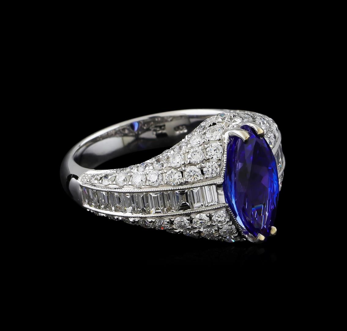 One electronically tested 18KT white gold ladies combination cast & assembled prong set ring with a bright polish finish. Identified with markings of "750". Condition is new. Containing: One prong set marquise modified brilliant cut natural tanzanite, measuring 12.66 x 7.23 x 4.70mm, approximate weight of 2.74ct., clarity is eye clean, type I, medium dark, moderately strong, bluish violet color, (GIA bV 6/4), cut is good. Ninety-Four prong set round brilliant cut diamonds, measuring 1.60 - 1.60 x 0.96mm (depth est.) approximate total weight of 94 Stones = 1.54ct. Clarity: SI-1. Color: I, Cut is Good. Twenty-Two channel set baguette cut diamonds, measuring 2.00 x 1.50 x 1.28mm (depth est.) approximate total weight of 22 Stones = 0.92ct. Clarity: VS-2. Color: I, Cut is Good. Colored gemstones are presumed to have been subjected to commonly used enhancement processes. All diamonds and colored gemstones are graded in the mounting, unless otherwise stated. Total Weight of Colored Stones 2.74ct. Total Weight of Diamonds 2.46ct. Total Weight of Ring 7.20 grams. GGL Appraised at $12,940.00.