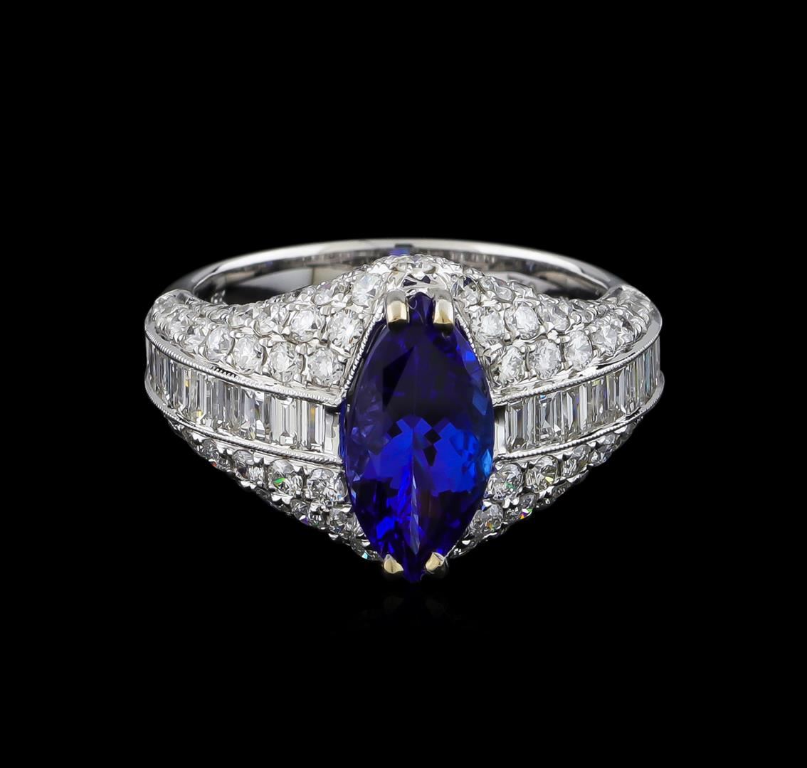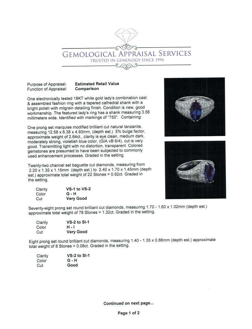 One electronically tested 18KT white gold ladies combination cast & assembled prong set ring with a bright polish finish. Identified with markings of "750". Condition is new. Containing: One prong set marquise modified brilliant cut natural tanzanite, measuring 12.66 x 7.23 x 4.70mm, approximate weight of 2.74ct., clarity is eye clean, type I, medium dark, moderately strong, bluish violet color, (GIA bV 6/4), cut is good. Ninety-Four prong set round brilliant cut diamonds, measuring 1.60 - 1.60 x 0.96mm (depth est.) approximate total weight of 94 Stones = 1.54ct. Clarity: SI-1. Color: I, Cut is Good. Twenty-Two channel set baguette cut diamonds, measuring 2.00 x 1.50 x 1.28mm (depth est.) approximate total weight of 22 Stones = 0.92ct. Clarity: VS-2. Color: I, Cut is Good. Colored gemstones are presumed to have been subjected to commonly used enhancement processes. All diamonds and colored gemstones are graded in the mounting, unless otherwise stated. Total Weight of Colored Stones 2.74ct. Total Weight of Diamonds 2.46ct. Total Weight of Ring 7.20 grams. GGL Appraised at $12,940.00.