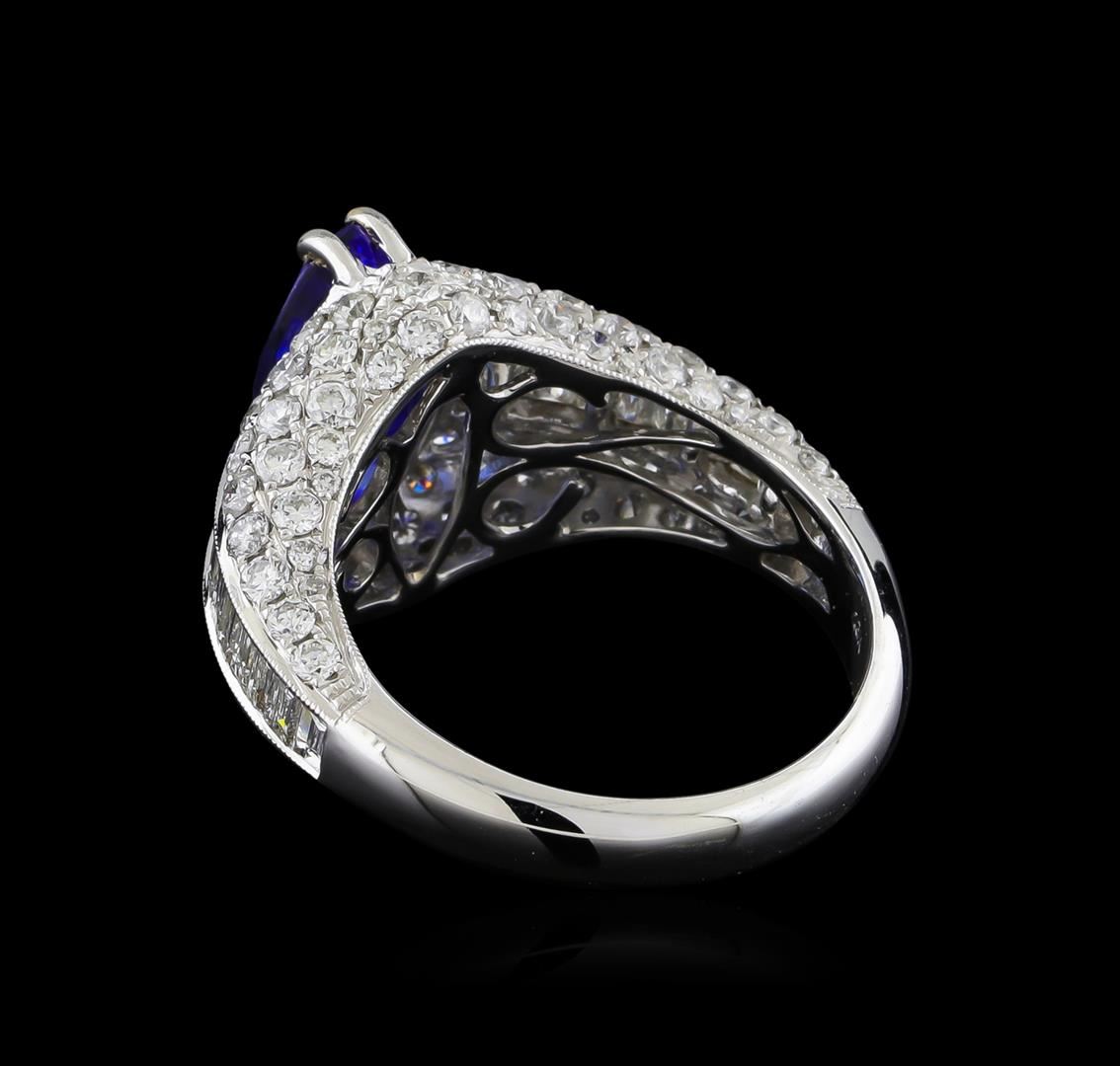 One electronically tested 18KT white gold ladies combination cast & assembled prong set ring with a bright polish finish. Identified with markings of "750". Condition is new. Containing: One prong set marquise modified brilliant cut natural tanzanite, measuring 12.66 x 7.23 x 4.70mm, approximate weight of 2.74ct., clarity is eye clean, type I, medium dark, moderately strong, bluish violet color, (GIA bV 6/4), cut is good. Ninety-Four prong set round brilliant cut diamonds, measuring 1.60 - 1.60 x 0.96mm (depth est.) approximate total weight of 94 Stones = 1.54ct. Clarity: SI-1. Color: I, Cut is Good. Twenty-Two channel set baguette cut diamonds, measuring 2.00 x 1.50 x 1.28mm (depth est.) approximate total weight of 22 Stones = 0.92ct. Clarity: VS-2. Color: I, Cut is Good. Colored gemstones are presumed to have been subjected to commonly used enhancement processes. All diamonds and colored gemstones are graded in the mounting, unless otherwise stated. Total Weight of Colored Stones 2.74ct. Total Weight of Diamonds 2.46ct. Total Weight of Ring 7.20 grams. GGL Appraised at $12,940.00.