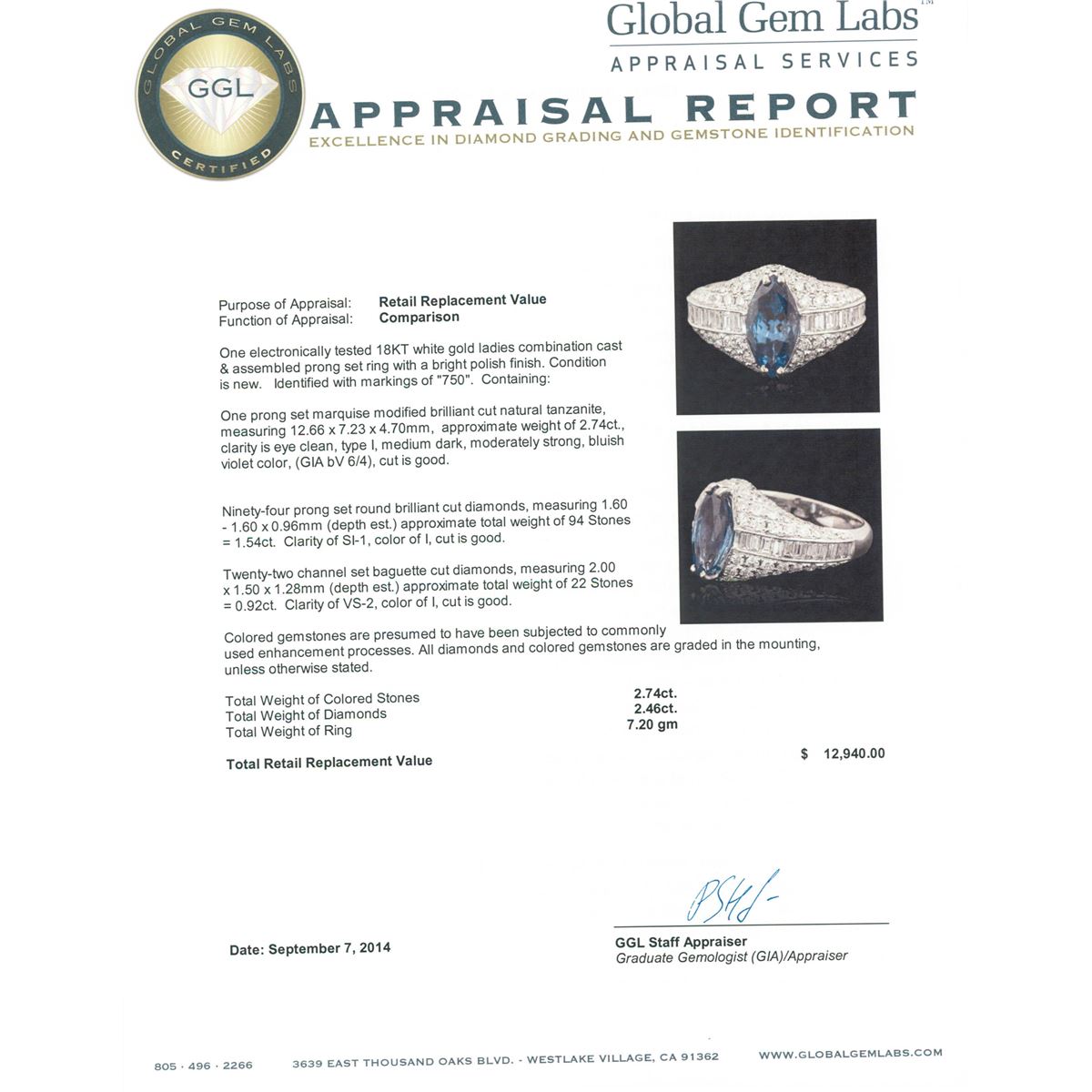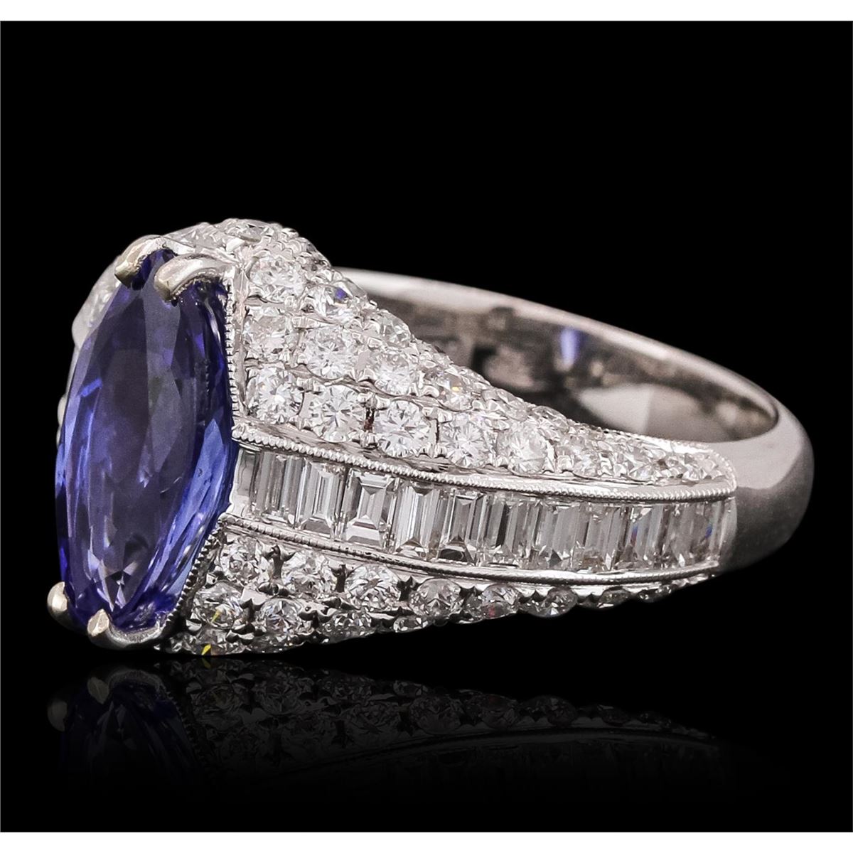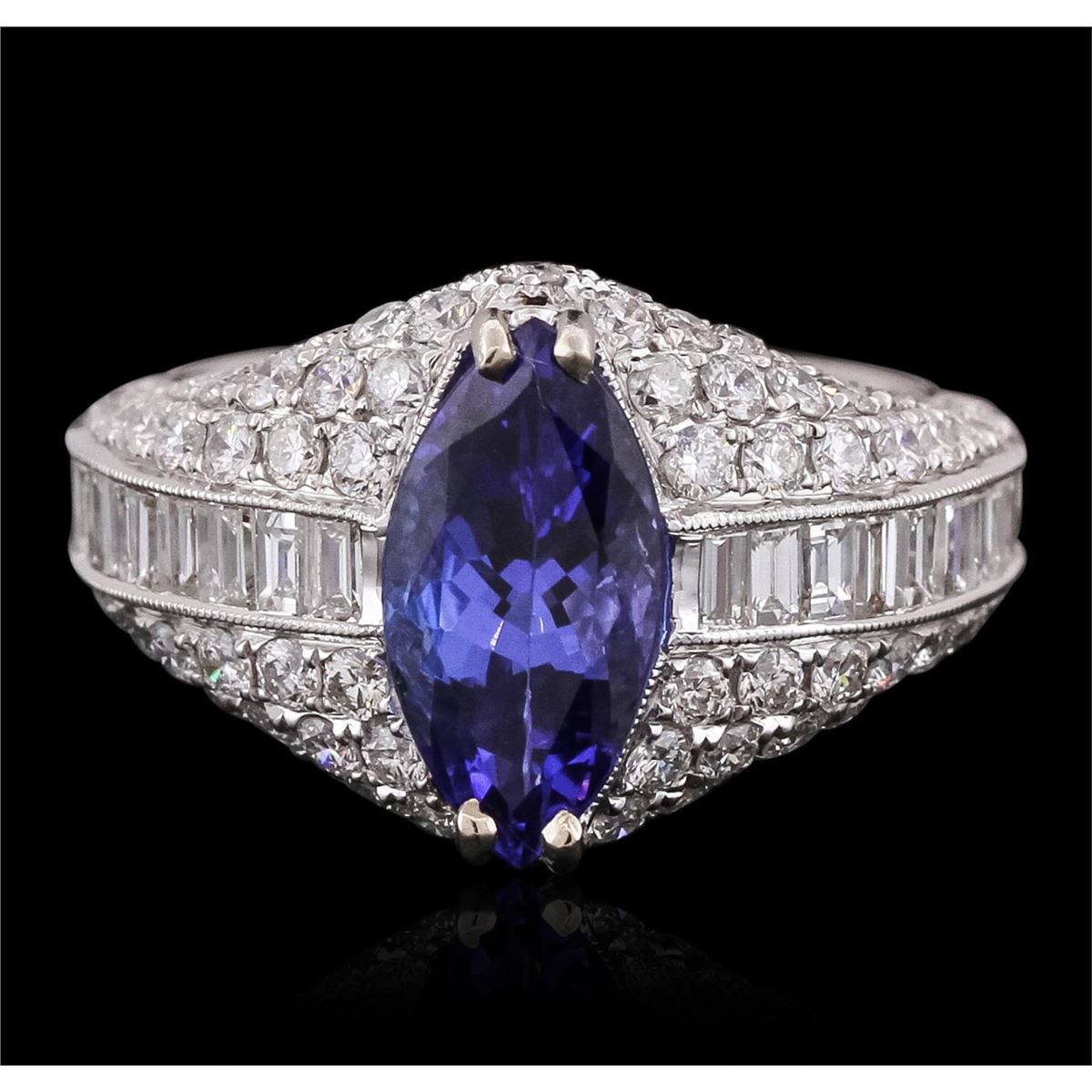 One electronically tested 18KT white gold ladies combination cast & assembled prong set ring with a bright polish finish. Identified with markings of "750". Condition is new. Containing: One prong set marquise modified brilliant cut natural tanzanite, measuring 12.66 x 7.23 x 4.70mm, approximate weight of 2.74ct., clarity is eye clean, type I, medium dark, moderately strong, bluish violet color, (GIA bV 6/4), cut is good. Ninety-Four prong set round brilliant cut diamonds, measuring 1.60 - 1.60 x 0.96mm (depth est.) approximate total weight of 94 Stones = 1.54ct. Clarity: SI-1. Color: I, Cut is Good. Twenty-Two channel set baguette cut diamonds, measuring 2.00 x 1.50 x 1.28mm (depth est.) approximate total weight of 22 Stones = 0.92ct. Clarity: VS-2. Color: I, Cut is Good. Colored gemstones are presumed to have been subjected to commonly used enhancement processes. All diamonds and colored gemstones are graded in the mounting, unless otherwise stated. Total Weight of Colored Stones 2.74ct. Total Weight of Diamonds 2.46ct. Total Weight of Ring 7.20 grams. GGL Appraised at $12,940.00.
