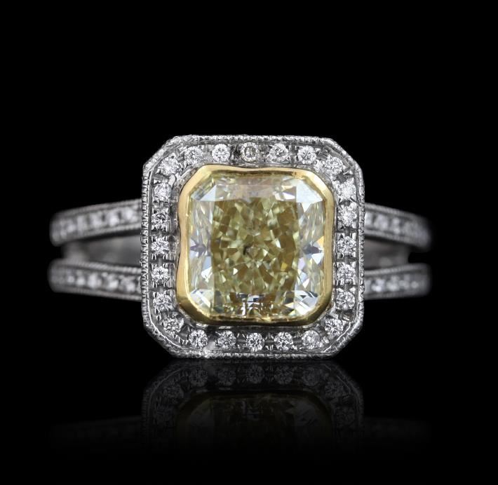 One electronically tested 18KT white gold ladies cast diamond ring with a bright polish finish with migraine detailing throughout. Condition is new, good workmanship. The featured diamond is mounted in an 18KT yellow gold accent basket, set within a diamond lattice gallery, supported by diamond set shoulders and completed by a four millimeter wide band. Identified with markings of "18K 750." Ring size is approximately 6.25. Total weight of diamonds is 2.75ct. Total weight of ring is 6.90gm. AIG Appraised at $34,600.00.