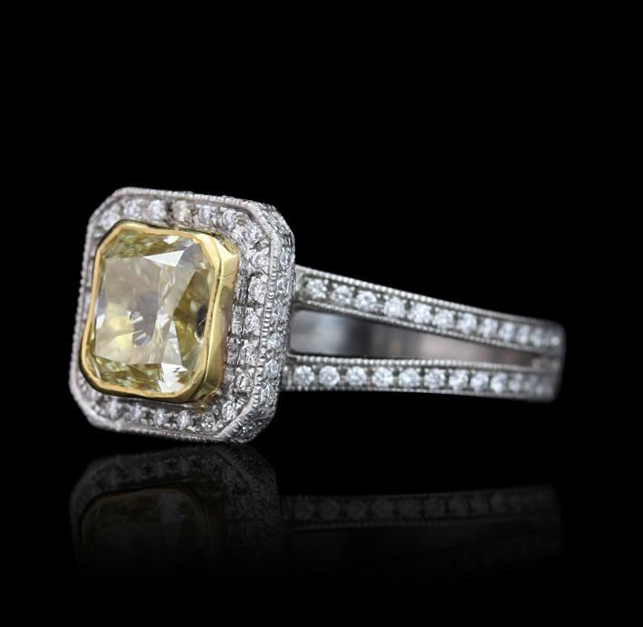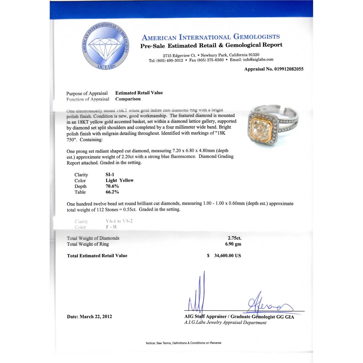 One electronically tested 18KT white gold ladies cast diamond ring with a bright polish finish with migraine detailing throughout. Condition is new, good workmanship. The featured diamond is mounted in an 18KT yellow gold accent basket, set within a diamond lattice gallery, supported by diamond set shoulders and completed by a four millimeter wide band. Identified with markings of "18K 750." Ring size is approximately 6.25. Total weight of diamonds is 2.75ct. Total weight of ring is 6.90gm. AIG Appraised at $34,600.00.