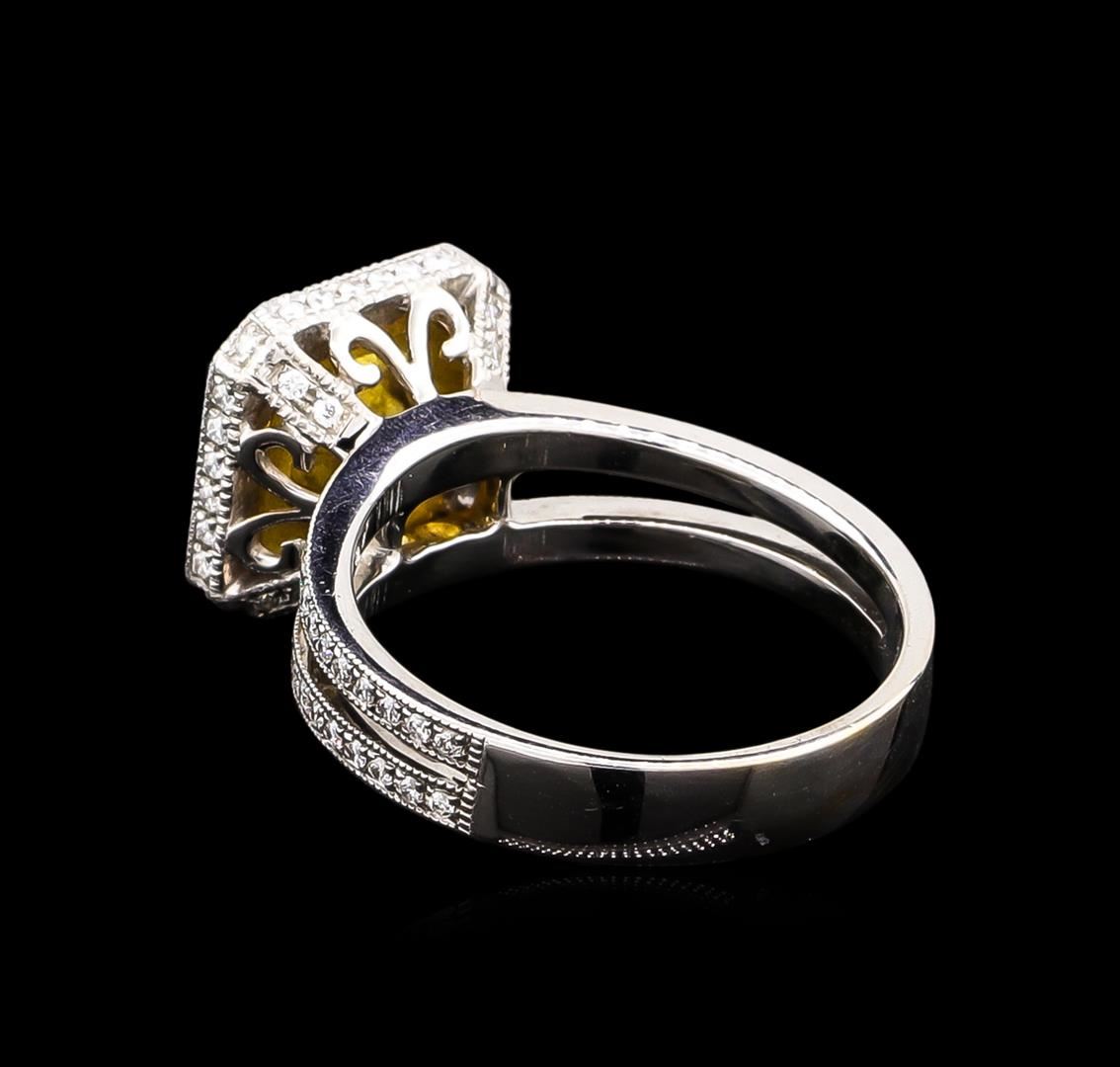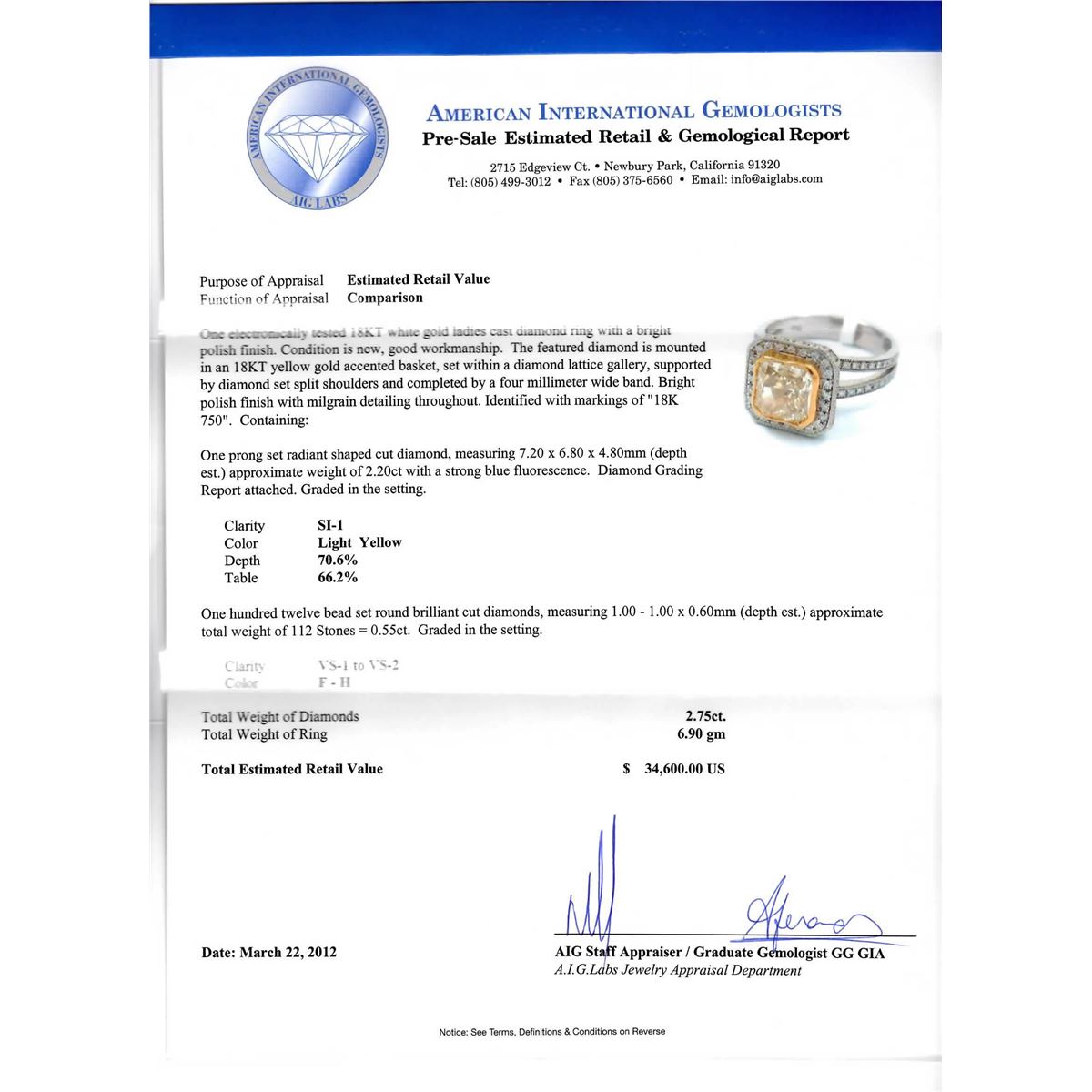 One electronically tested 18KT white gold ladies cast diamond ring with a bright polish finish with migraine detailing throughout. Condition is new, good workmanship. The featured diamond is mounted in an 18KT yellow gold accent basket, set within a diamond lattice gallery, supported by diamond set shoulders and completed by a four millimeter wide band. Identified with markings of "18K 750." Ring size is approximately 6.25. Total weight of diamonds is 2.75ct. Total weight of ring is 6.90gm. AIG Appraised at $34,600.00.