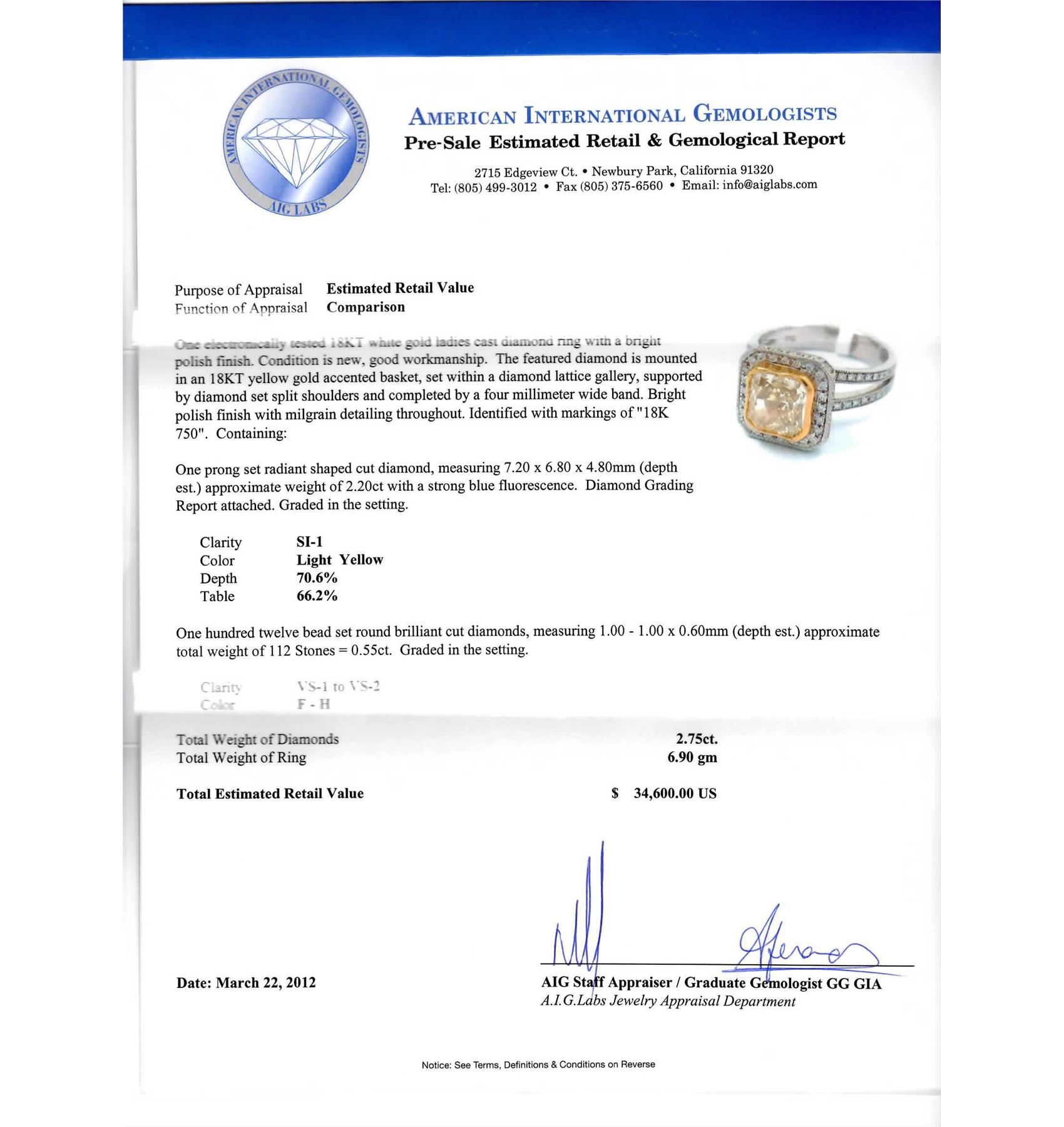 One electronically tested 18KT white gold ladies cast diamond ring with a bright polish finish with migraine detailing throughout. Condition is new, good workmanship. The featured diamond is mounted in an 18KT yellow gold accent basket, set within a diamond lattice gallery, supported by diamond set shoulders and completed by a four millimeter wide band. Identified with markings of "18K 750." Ring size is approximately 6.25. Total weight of diamonds is 2.75ct. Total weight of ring is 6.90gm. AIG Appraised at $34,600.00.