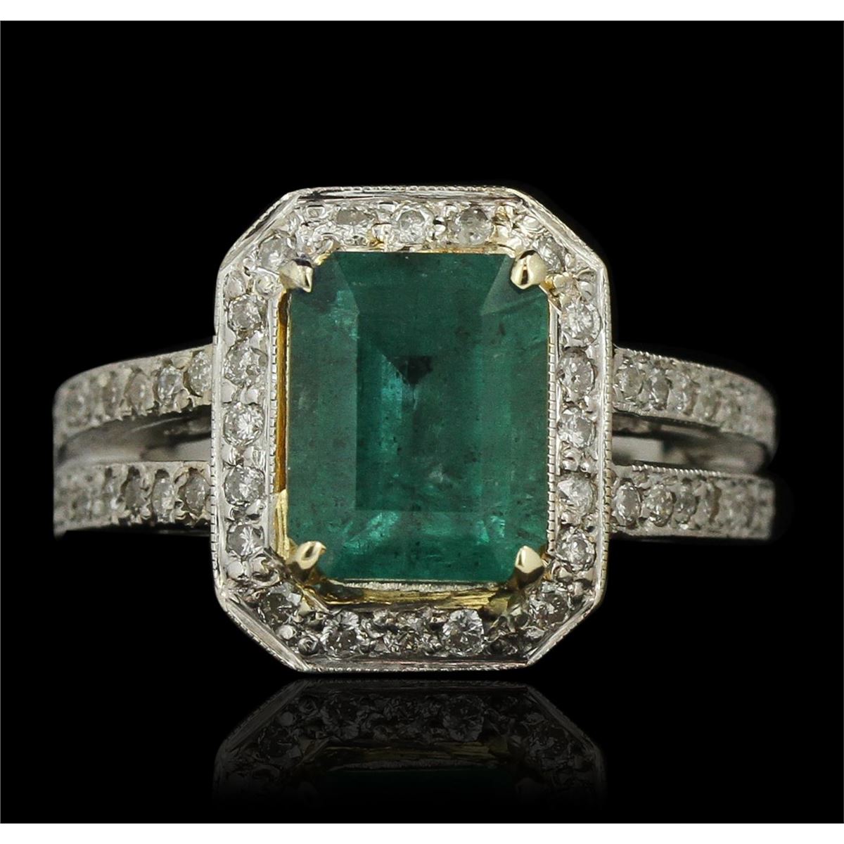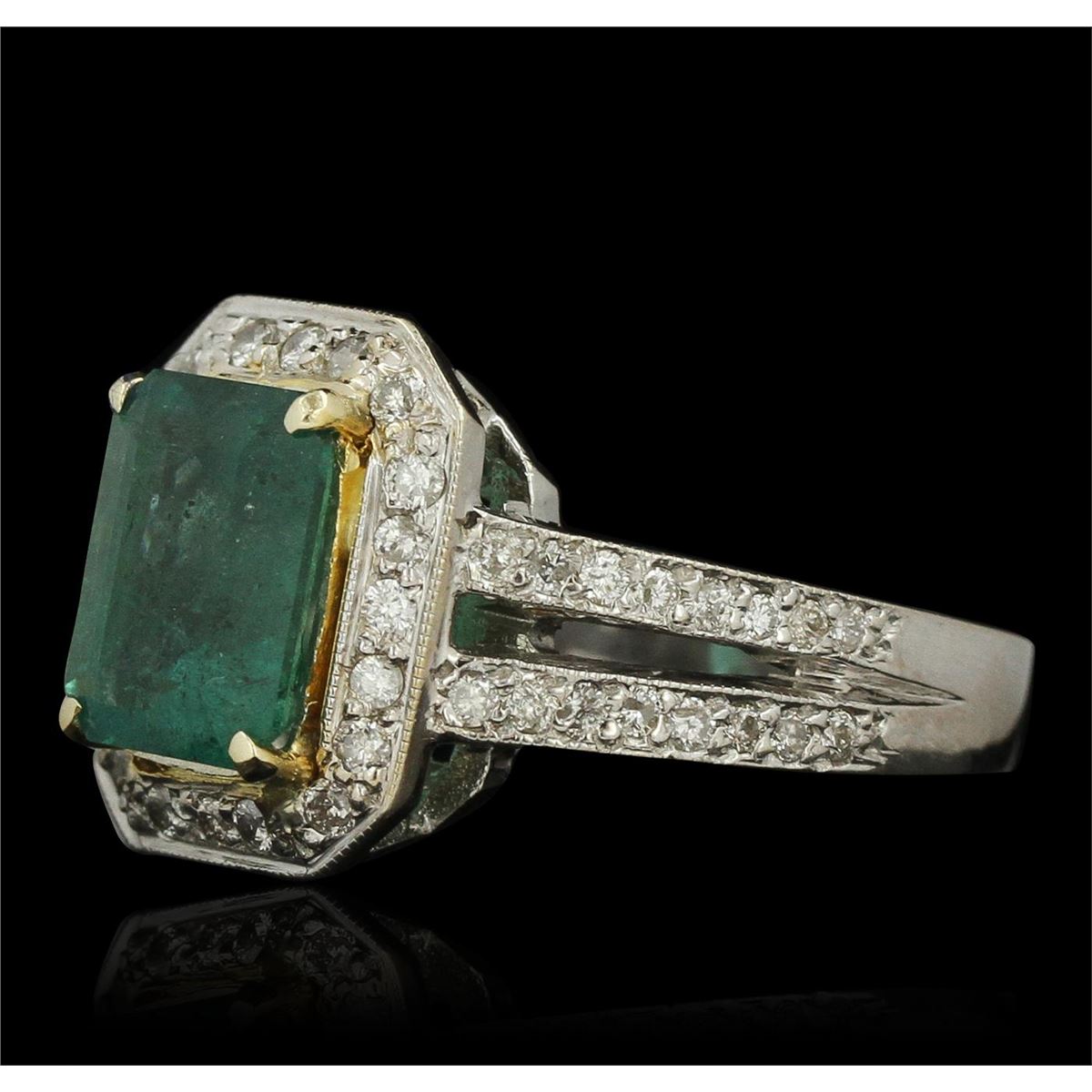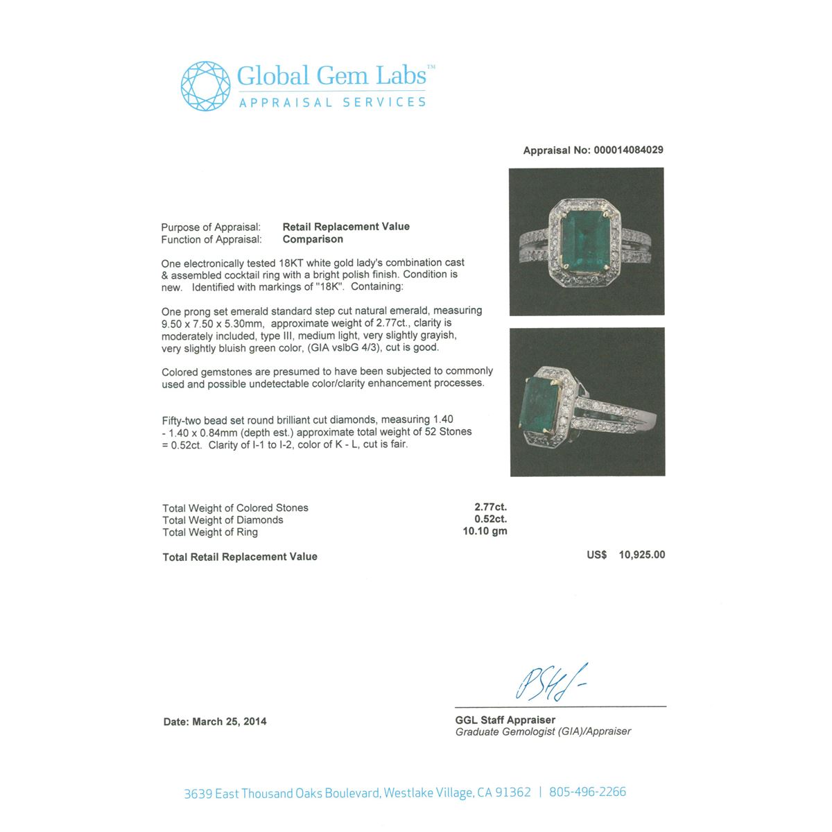 One electronically tested 18KT white gold Ladies combination cast & assembled cocktail ring with a bright polish finish. Condition is new. Identified with markings of "18K". Containing: One prong set emerald standard step cut natural emerald, measuring 9.50 x 7.50 x 5.30mm, approximate weight of 2.77ct., clarity is moderately included, type III, medium light, very slightly grayish, very slightly bluish green color, (GIA vslbG 4/3), cut is good. Colored gemstones are presumed to have been subjected to commonly used and possible undetectable color/clarity enhancement processes. Fifty-Two bead set round brilliant cut diamonds, measuring 1.40 - 1.40 x 0.84mm (depth est.) approximate. Total Weight of 52 Stones = 0.52ct. Clarity: I-1 to I-2. Color: K - L, Cut is Fair. Total Weight of Colored Stones 2.77ct. Total Weight of Diamonds 0.52ct. Total Weight of Ring 10.10 grams. GGL Appraised at $10,925.00.