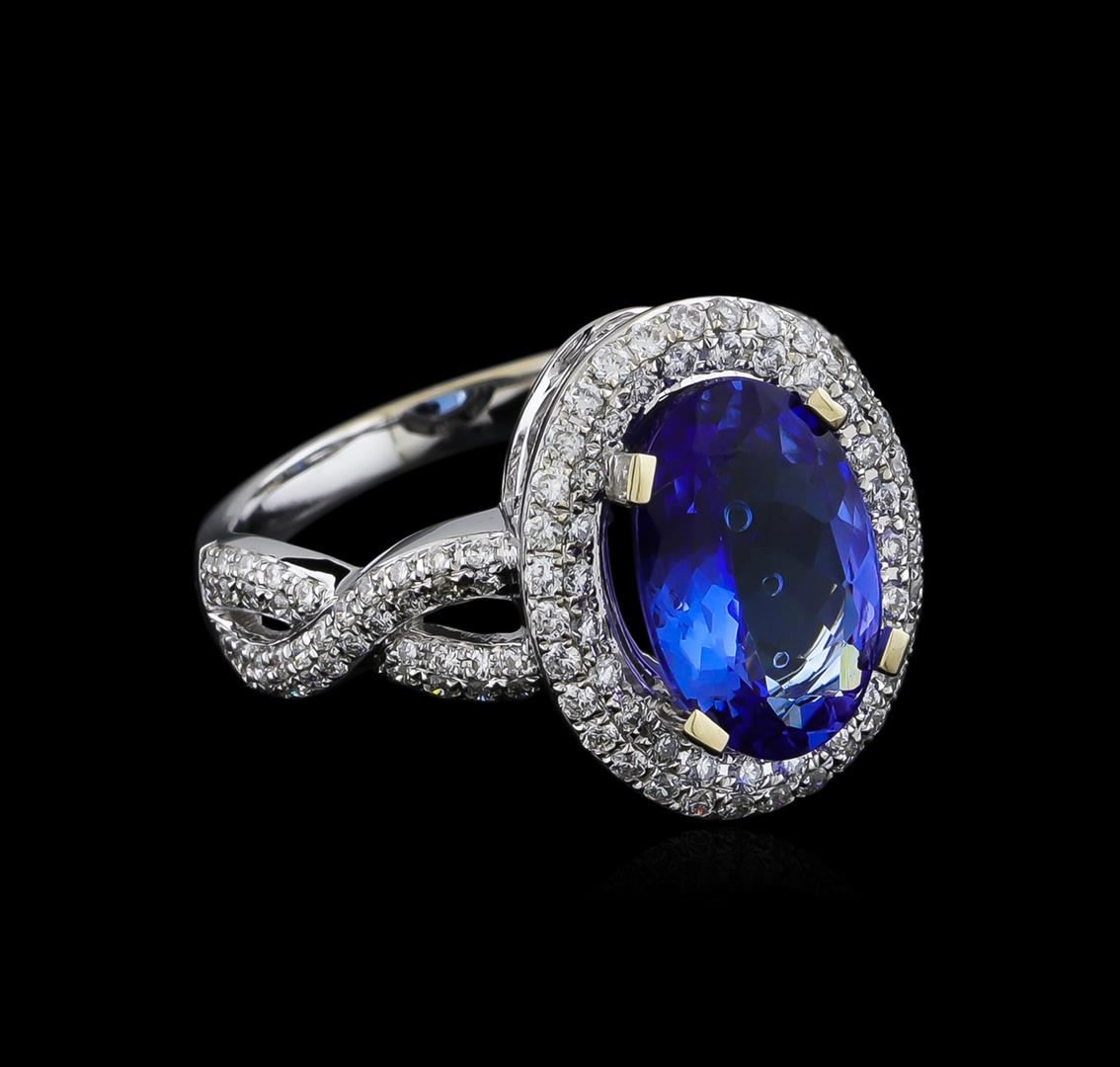 One electronically tested 18KT white gold ladies combination cast & assembled prong set ring with a split shank with a bright polish finish. Identified with markings of "750 18K". Condition is new. Containing: One prong set oval modified brilliant cut natural tanzanite, measuring 11.81 x 7.80 x 4.33mm, approximate weight of 2.79ct., clarity is eye clean, type I, medium light, very slightly grayish, violet color, (GIA V 4/3), cut is good. One Hundred Thirty-Five bead set round brilliant cut diamonds, measuring 1.00 - 1.00 x 0.60mm (depth est.) approximate total weight of 135 Stones = 0.59ct. Clarity: I-1 to I-2. Color: H - I, Cut is Good. All diamonds are graded in the mounting, unless otherwise stated, Colored gemstones are presumed to have been subjected to commonly used enhancement processes. Total Weight of Colored Stones 2.79ct. Total Weight of Diamonds 0.59ct. Total Weight of Ring 6.30 grams. GGL Appraised at $8,480.00.