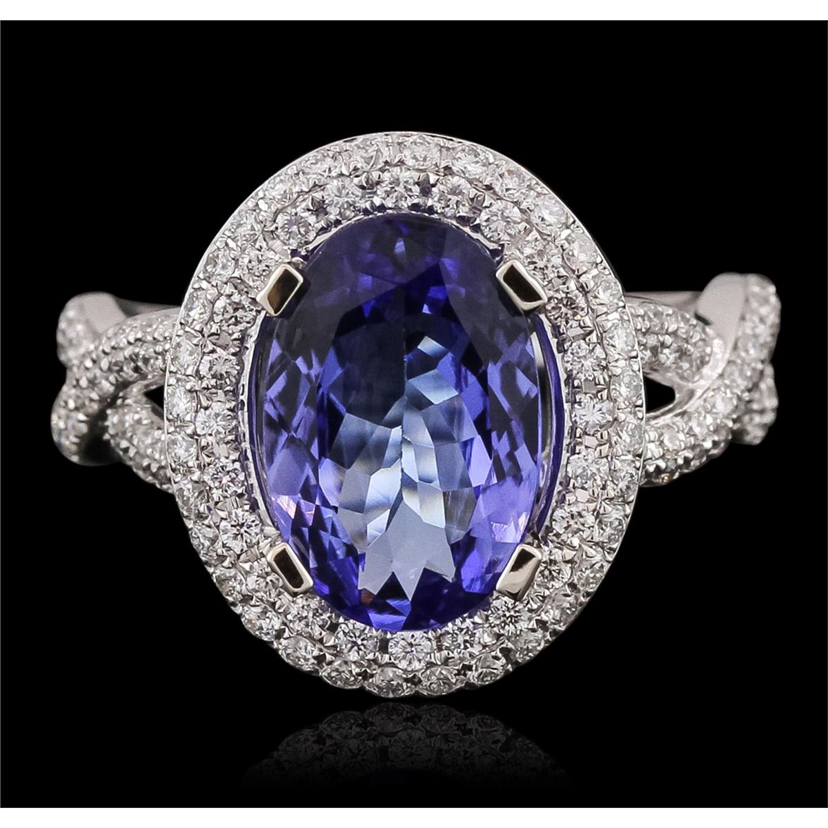 One electronically tested 18KT white gold ladies combination cast & assembled prong set ring with a split shank with a bright polish finish. Identified with markings of "750 18K". Condition is new. Containing: One prong set oval modified brilliant cut natural tanzanite, measuring 11.81 x 7.80 x 4.33mm, approximate weight of 2.79ct., clarity is eye clean, type I, medium light, very slightly grayish, violet color, (GIA V 4/3), cut is good. One Hundred Thirty-Five bead set round brilliant cut diamonds, measuring 1.00 - 1.00 x 0.60mm (depth est.) approximate total weight of 135 Stones = 0.59ct. Clarity: I-1 to I-2. Color: H - I, Cut is Good. All diamonds are graded in the mounting, unless otherwise stated, Colored gemstones are presumed to have been subjected to commonly used enhancement processes. Total Weight of Colored Stones 2.79ct. Total Weight of Diamonds 0.59ct. Total Weight of Ring 6.30 grams. GGL Appraised at $8,480.00.