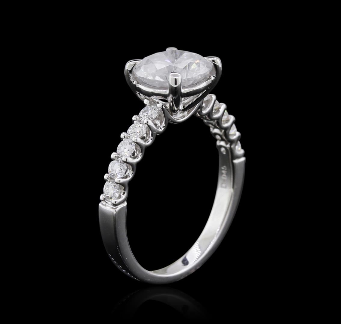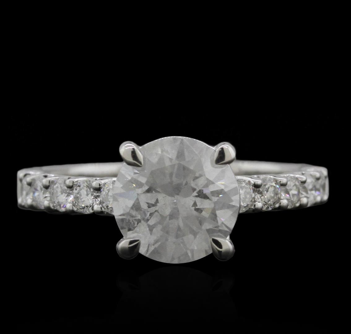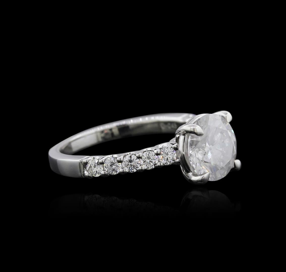 One electronically tested 18KT white gold ladies cast diamond engagement ring with a bright polish finish. Identified with markings of "750". Condition is very good. Containing: One prong set round brilliant cut diamond, measuring 8.21 - 8.20 x 5.87mm (depth est.) approximate weight of 2.41ct. Clarity: I-3. Color: G, Cut is Good. Ten prong set round brilliant cut diamonds, measuring 2.20 - 2.20 x 1.32mm (depth est.) approximate. Total Weight of 10 Stones = 0.45ct. Clarity: SI-1 to SI-2. Color: G - H, Cut is Good. All diamonds are graded in the mounting, unless otherwise stated. Total Weight of Diamonds 2.86ct. Total Weight of Engagement Ring 4.10 grams. GGL Appraised at $8,550.00.