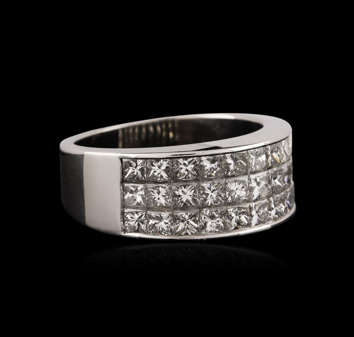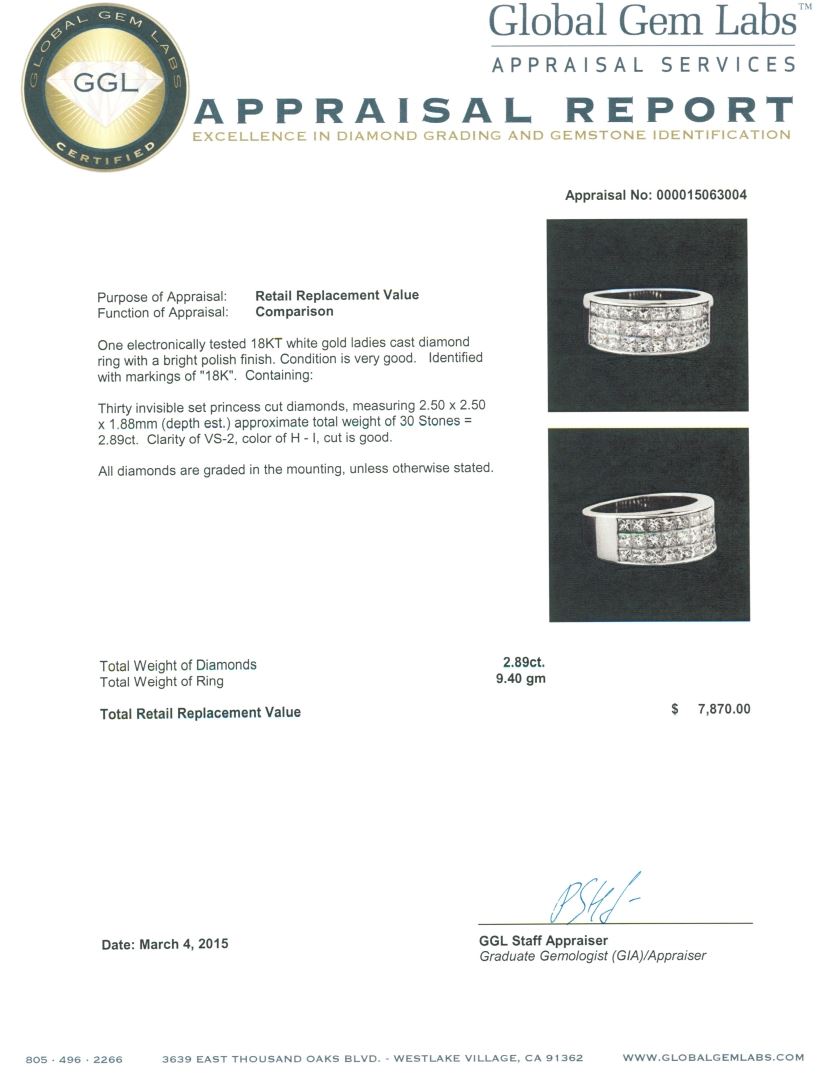 One electronically tested 18KT white gold ladies cast diamond ring with a bright polish finish. Identified with markings of "18K". Condition is very good. Containing: Thirty invisible set princess cut diamonds, measuring 2.50 x 2.50 x 1.88mm (depth est.) approximate total weight of 30 Stones = 2.89ct. Clarity: VS-2. Color: H - I, Cut is Good. All diamonds are graded in the mounting, unless otherwise stated. Total Weight of Diamonds 2.89ct. Total Weight of Ring 9.40 grams. GGL Appraised at $7,868.00.