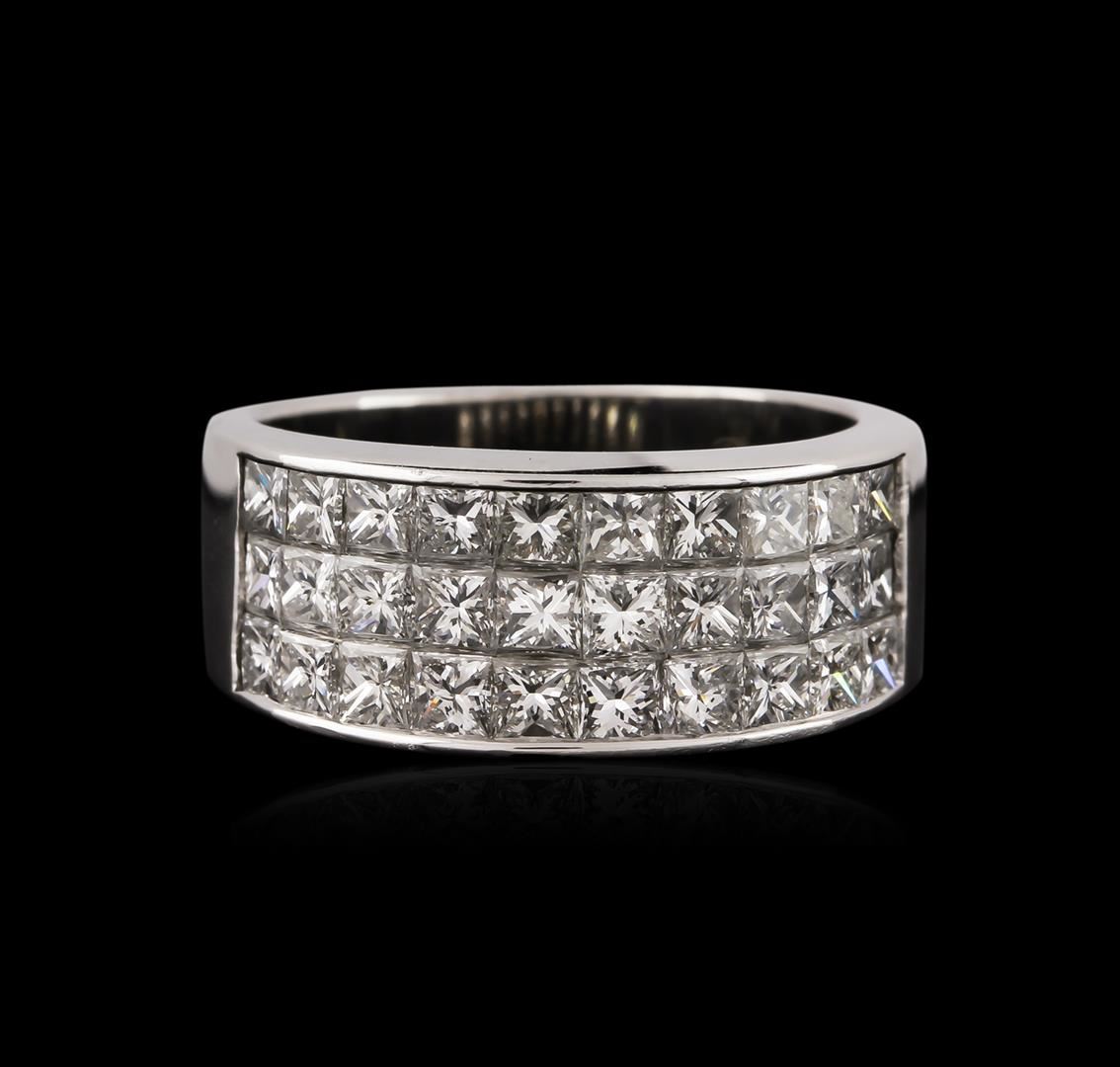 One electronically tested 18KT white gold ladies cast diamond ring with a bright polish finish. Identified with markings of "18K". Condition is very good. Containing: Thirty invisible set princess cut diamonds, measuring 2.50 x 2.50 x 1.88mm (depth est.) approximate total weight of 30 Stones = 2.89ct. Clarity: VS-2. Color: H - I, Cut is Good. All diamonds are graded in the mounting, unless otherwise stated. Total Weight of Diamonds 2.89ct. Total Weight of Ring 9.40 grams. GGL Appraised at $7,868.00.