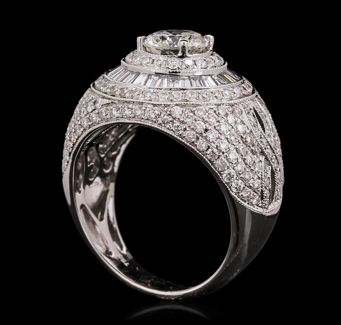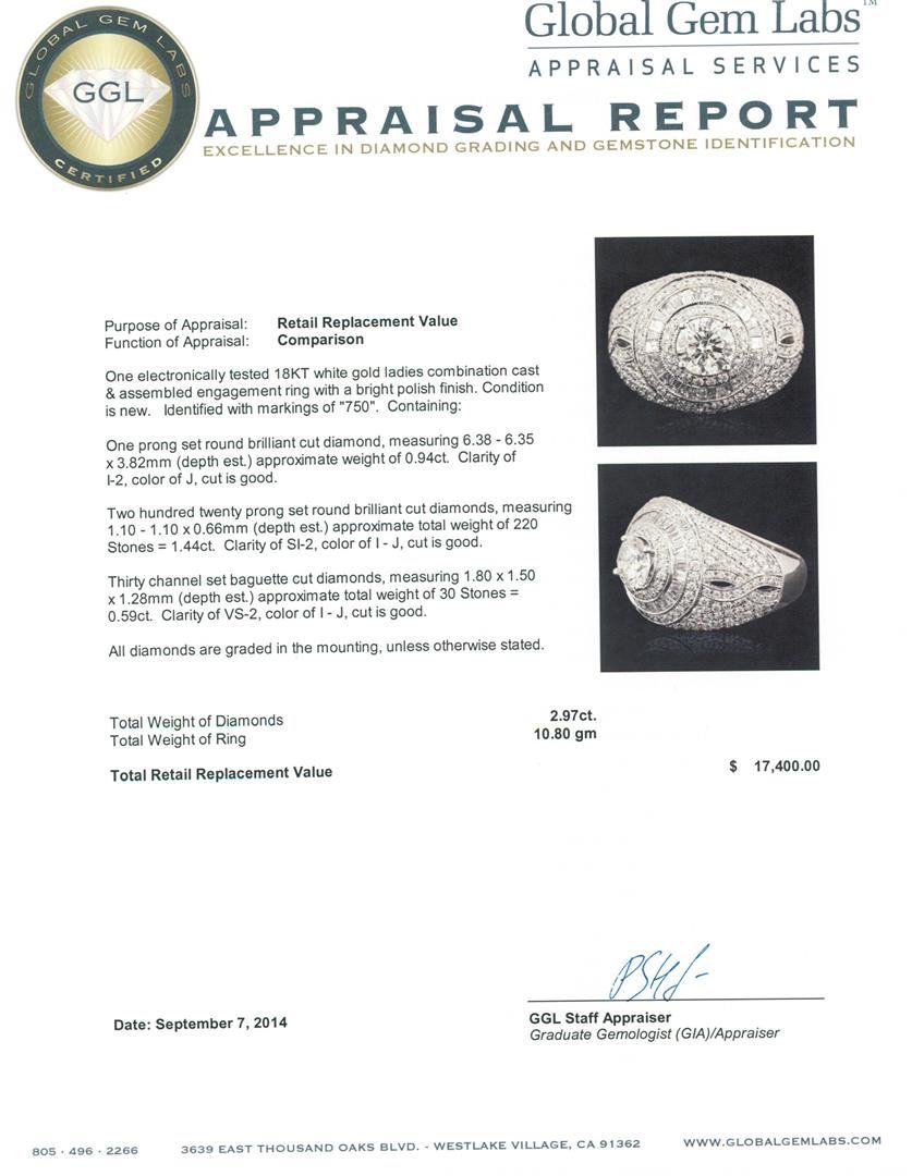 One electronically tested 18KT white gold ladies combination cast & assembled engagement ring with a bright polish finish. Identified with markings of "750". Condition is new. Containing: One prong set round brilliant cut diamond, measuring 6.38 - 6.35 x 3.82mm (depth est.) approximate weight of 0.94ct. Clarity: I-2. Color: J, Cut is Good. Two Hundred Twenty prong set round brilliant cut diamonds, measuring 1.10 - 1.10 x 0.66mm (depth est.) approximate total weight of 220 Stones = 1.44ct. Clarity: SI-2. Color: I - J, Cut is Good. Thirty channel set baguette cut diamonds, measuring 1.80 x 1.50 x 1.28mm (depth est.) approximate total weight of 30 Stones = 0.59ct. Clarity: VS-2. Color: I - J, Cut is Good. All diamonds are graded in the mounting, unless otherwise stated. Total Weight of Diamonds 2.97ct. Total Weight of Ring 10.80 grams. GGL Appraised.