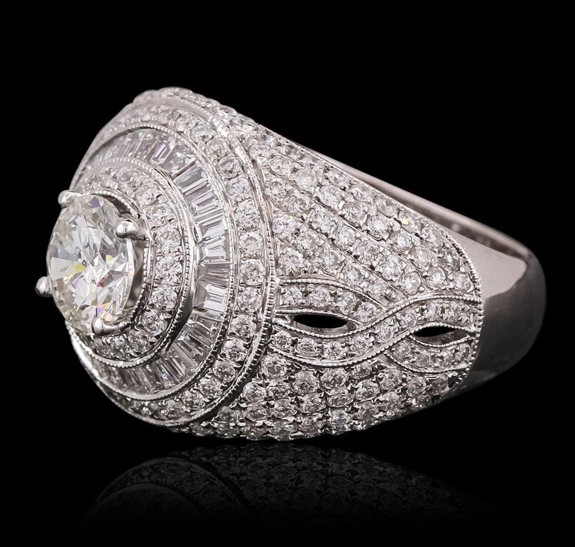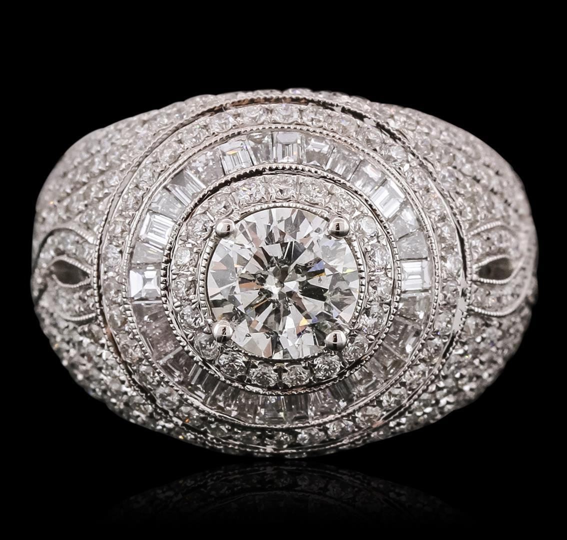 One electronically tested 18KT white gold ladies combination cast & assembled engagement ring with a bright polish finish. Identified with markings of "750". Condition is new. Containing: One prong set round brilliant cut diamond, measuring 6.38 - 6.35 x 3.82mm (depth est.) approximate weight of 0.94ct. Clarity: I-2. Color: J, Cut is Good. Two Hundred Twenty prong set round brilliant cut diamonds, measuring 1.10 - 1.10 x 0.66mm (depth est.) approximate total weight of 220 Stones = 1.44ct. Clarity: SI-2. Color: I - J, Cut is Good. Thirty channel set baguette cut diamonds, measuring 1.80 x 1.50 x 1.28mm (depth est.) approximate total weight of 30 Stones = 0.59ct. Clarity: VS-2. Color: I - J, Cut is Good. All diamonds are graded in the mounting, unless otherwise stated. Total Weight of Diamonds 2.97ct. Total Weight of Ring 10.80 grams. GGL Appraised.