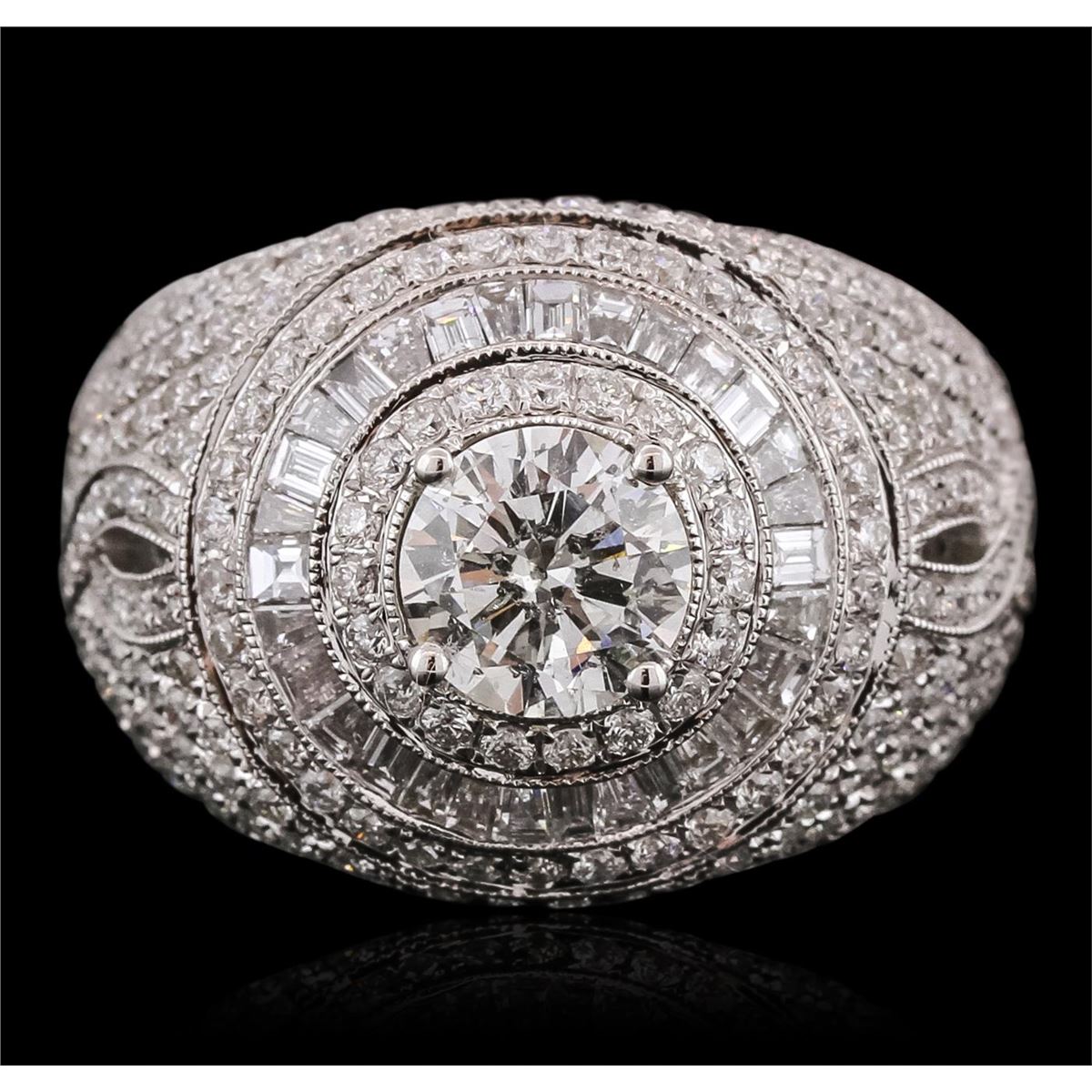 One electronically tested 18KT white gold ladies combination cast & assembled engagement ring with a bright polish finish. Identified with markings of "750". Condition is new. Containing: One prong set round brilliant cut diamond, measuring 6.38 - 6.35 x 3.82mm (depth est.) approximate weight of 0.94ct. Clarity: I-2. Color: J, Cut is Good. Two Hundred Twenty prong set round brilliant cut diamonds, measuring 1.10 - 1.10 x 0.66mm (depth est.) approximate total weight of 220 Stones = 1.44ct. Clarity: SI-2. Color: I - J, Cut is Good. Thirty channel set baguette cut diamonds, measuring 1.80 x 1.50 x 1.28mm (depth est.) approximate total weight of 30 Stones = 0.59ct. Clarity: VS-2. Color: I - J, Cut is Good. All diamonds are graded in the mounting, unless otherwise stated. Total Weight of Diamonds 2.97ct. Total Weight of Ring 10.80 grams. GGL Appraised at $17,400.00.