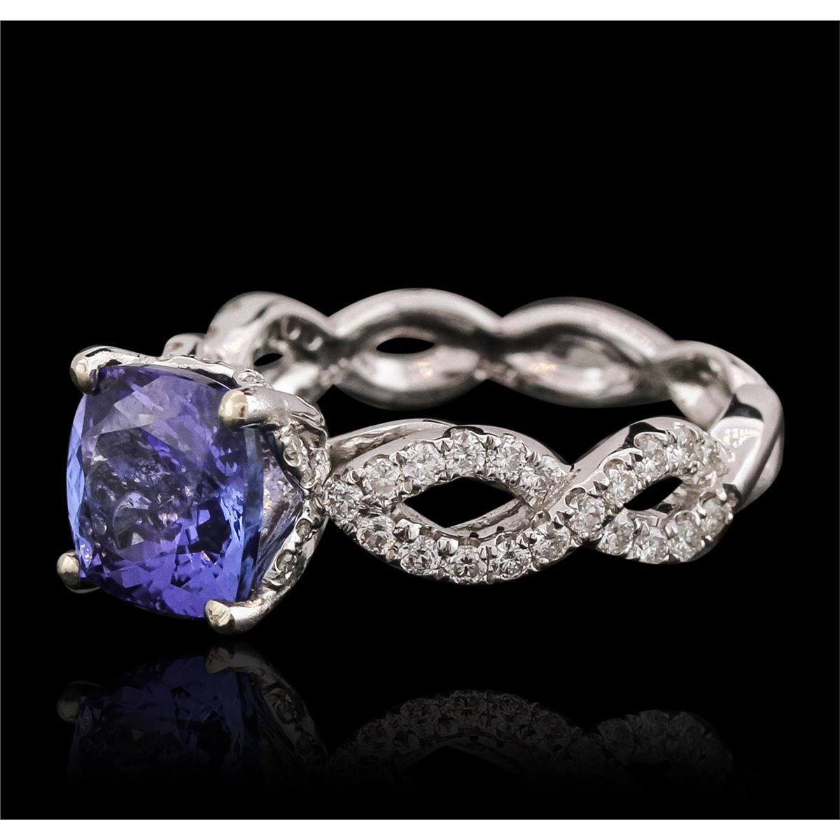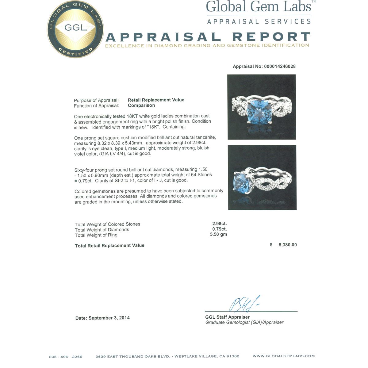 One electronically tested 18KT white gold ladies combination cast & assembled engagement ring with a bright polish finish. Identified with markings of "18K". Condition is new. Containing: One prong set square cushion modified brilliant cut natural tanzanite, measuring 8.32 x 8.39 x 5.43mm, approximate weight of 2.98ct., clarity is eye clean, type I, medium light, moderately strong, bluish violet color, (GIA bV 4/4), cut is good. Sixty-Four prong set round brilliant cut diamonds, measuring 1.50 - 1.50 x 0.90mm (depth est.) approximate total weight of 64 Stones = 0.79ct. Clarity: SI-2 to I-1. Color: I - J, Cut is Good. Colored gemstones are presumed to have been subjected to commonly used enhancement processes. All diamonds and colored gemstones are graded in the mounting, unless otherwise stated. Total Weight of Colored Stones 2.98ct. Total Weight of Diamonds 0.79ct. Total Weight of Ring 5.50 grams. GGL Appraised at $8,380.00.