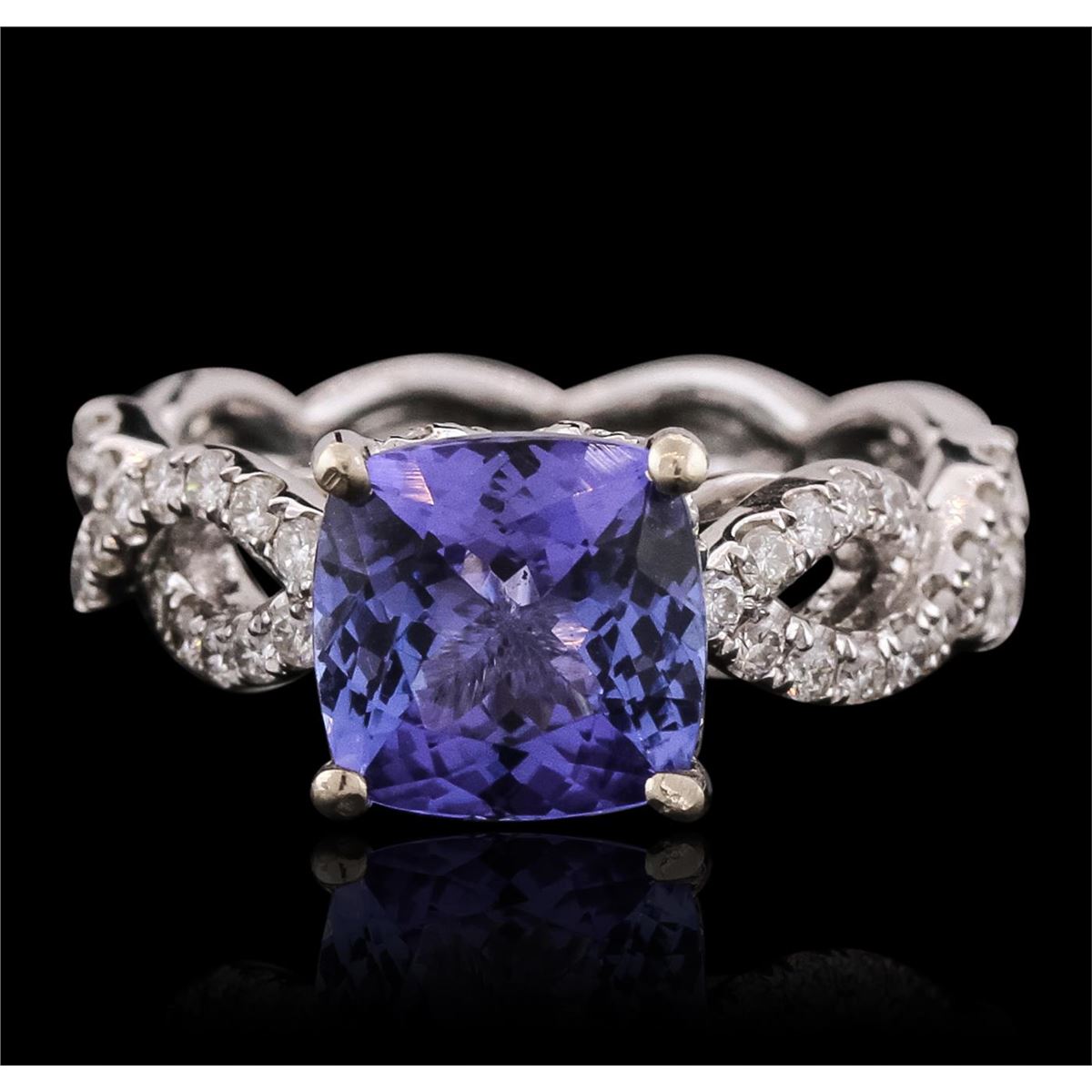 One electronically tested 18KT white gold ladies combination cast & assembled engagement ring with a bright polish finish. Identified with markings of "18K". Condition is new. Containing: One prong set square cushion modified brilliant cut natural tanzanite, measuring 8.32 x 8.39 x 5.43mm, approximate weight of 2.98ct., clarity is eye clean, type I, medium light, moderately strong, bluish violet color, (GIA bV 4/4), cut is good. Sixty-Four prong set round brilliant cut diamonds, measuring 1.50 - 1.50 x 0.90mm (depth est.) approximate total weight of 64 Stones = 0.79ct. Clarity: SI-2 to I-1. Color: I - J, Cut is Good. Colored gemstones are presumed to have been subjected to commonly used enhancement processes. All diamonds and colored gemstones are graded in the mounting, unless otherwise stated. Total Weight of Colored Stones 2.98ct. Total Weight of Diamonds 0.79ct. Total Weight of Ring 5.50 grams. GGL Appraised at $8,380.00.