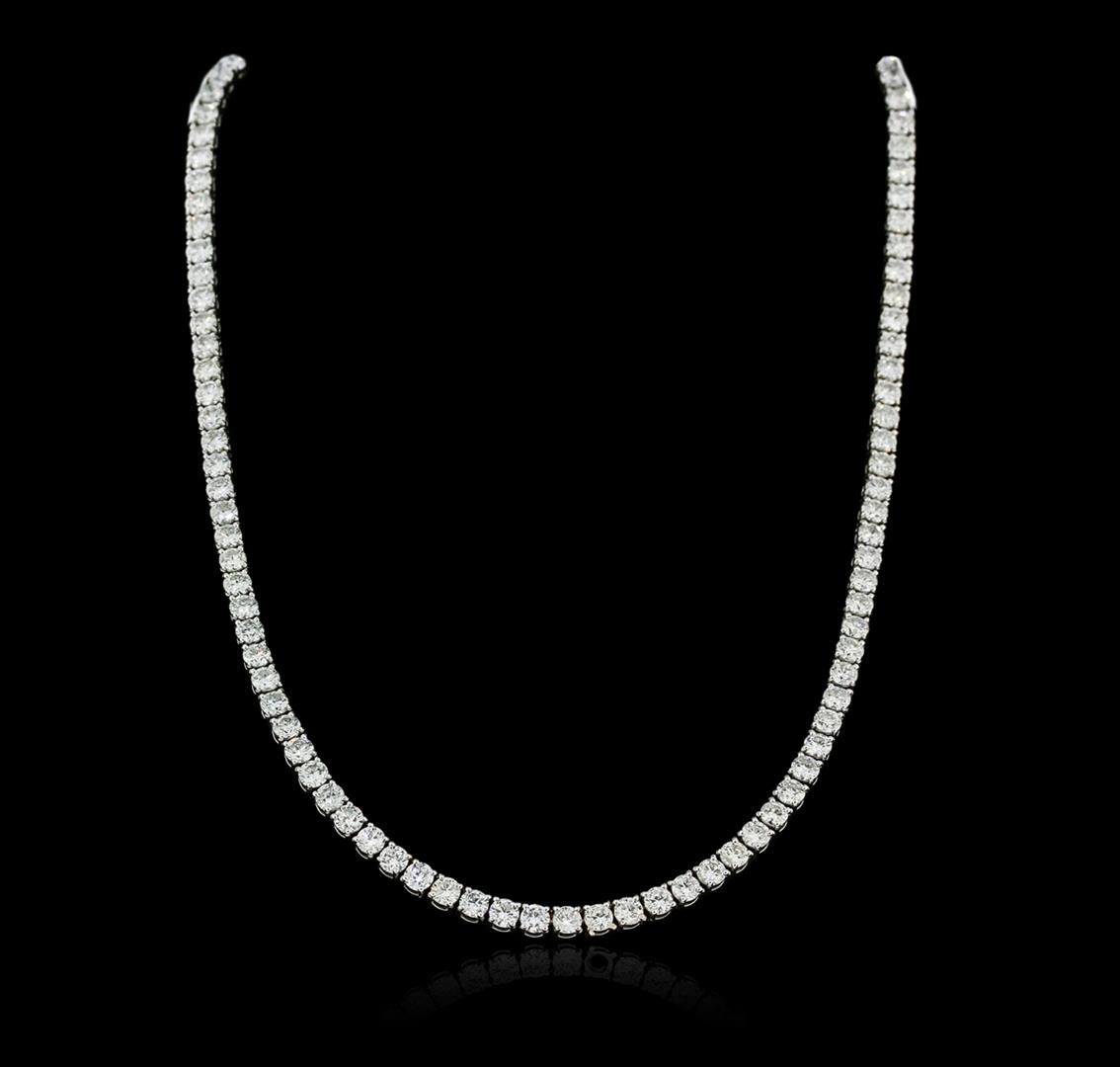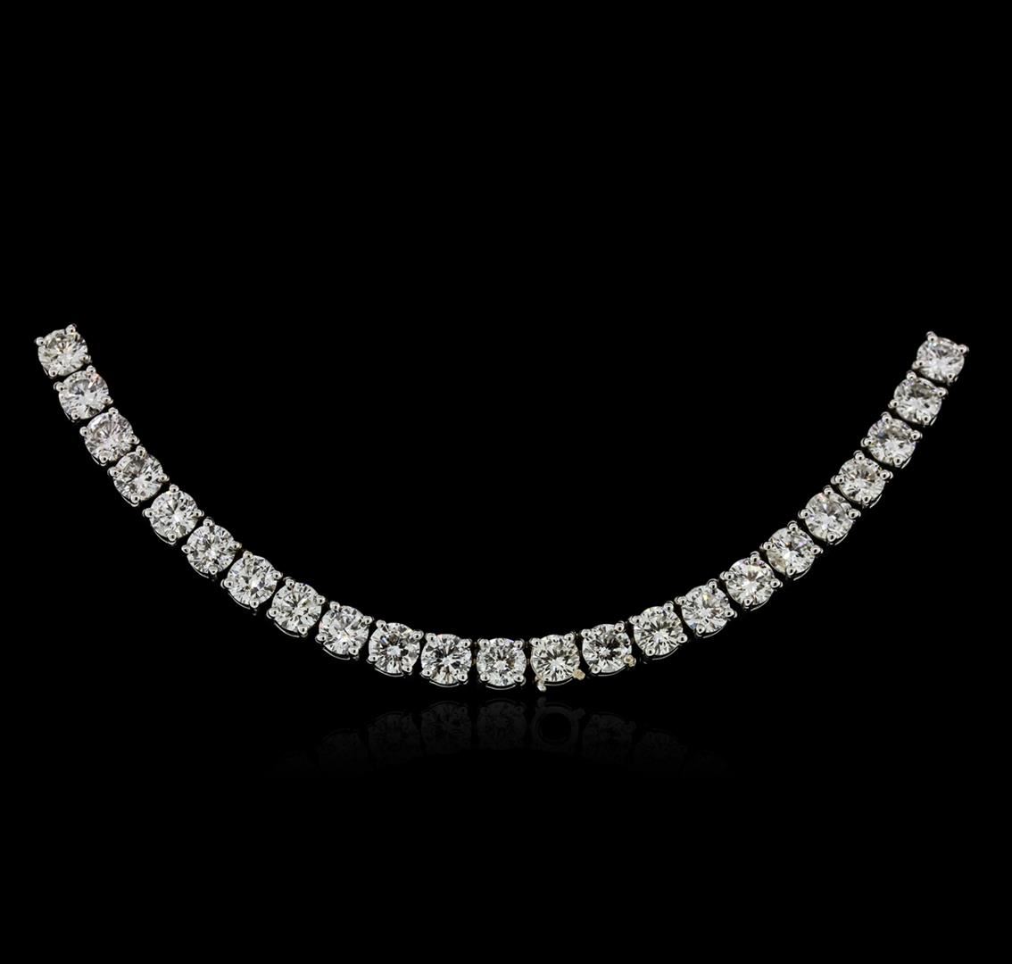 One electronically tested 18KT white gold ladies cast diamond necklace with a hidden box clasp with safety closer with a bright polish finish. Measurements: 16.50" in length Identified with markings of "750". Condition is new. Containing: One Hundred Five prong set round brilliant cut diamonds, measuring 3.80 - 3.80 x 2.28mm (depth est.) approximate total weight of 105 Stones = 21.08ct. Clarity: SI-1 to I-1. Color: I - J, Cut is Good. All diamonds are graded in the mounting, unless otherwise stated. Total Weight of Diamonds 21.08ct. Total Weight of Necklace 33.10 grams. GGL Appraised at $47,885.00.